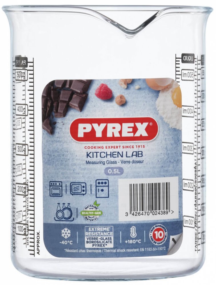 Pyrex odměrka je vyrobena z vysoce odolného skla, které lze vložit i do trouby. Nepožívejte ale při teplotách nad 180 °C - mohla by se poškodit stupnice.