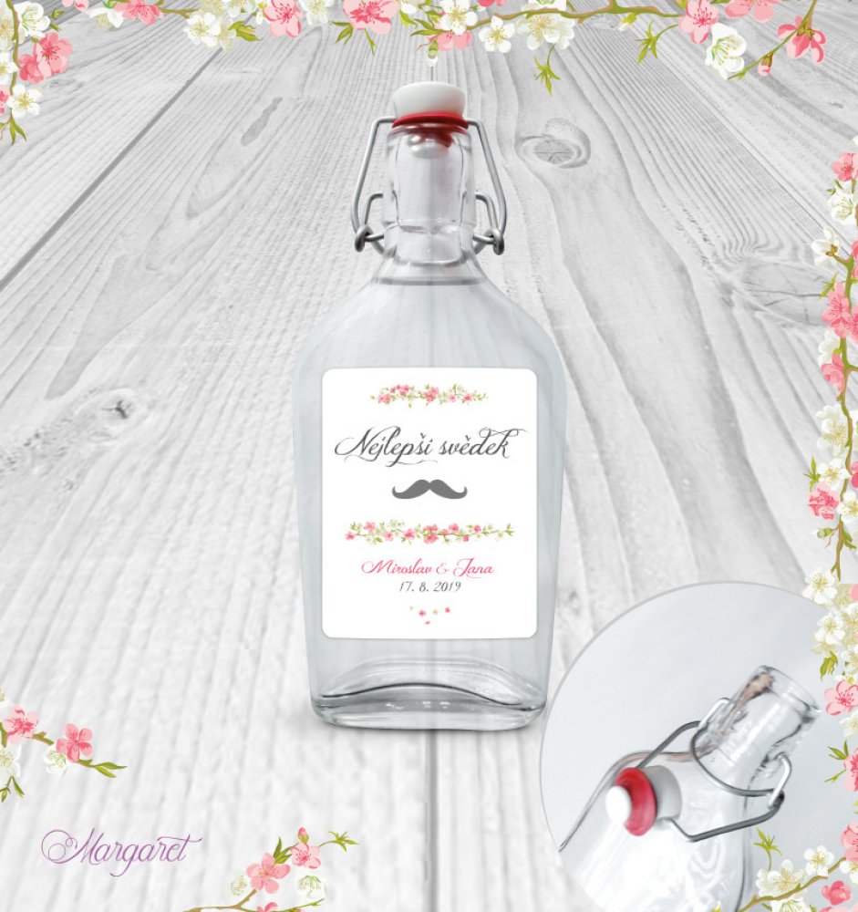 Skleněná láhev s pákovým uzávěrem, etiketa na samolepícím papíře s vyšší gramáží.