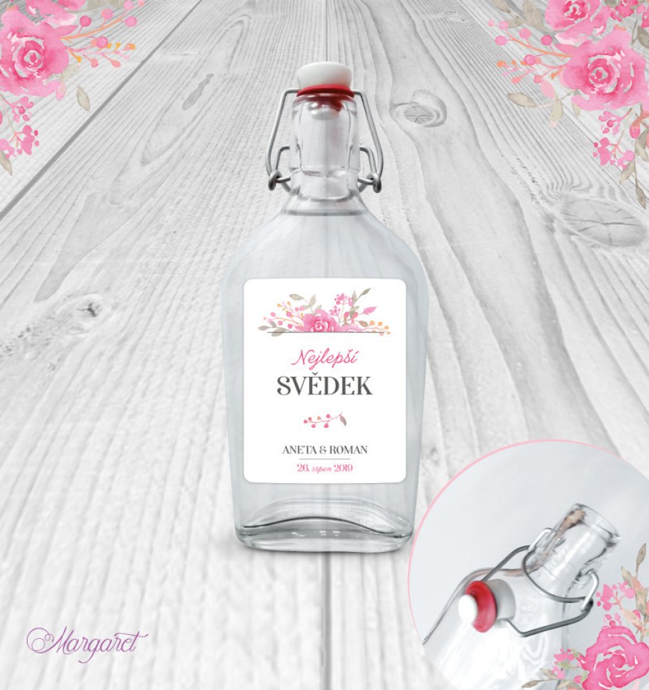 Skleněná láhev s pákovým uzávěrem, etiketa na samolepícím papíře s vyšší gramáží.