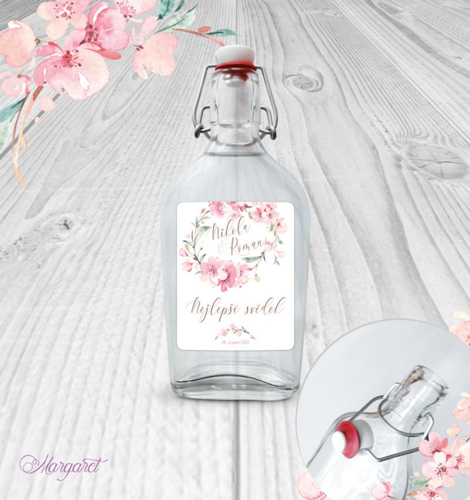 Skleněná láhev s pákovým uzávěrem, etiketa na samolepícím papíře s vyšší gramáží.