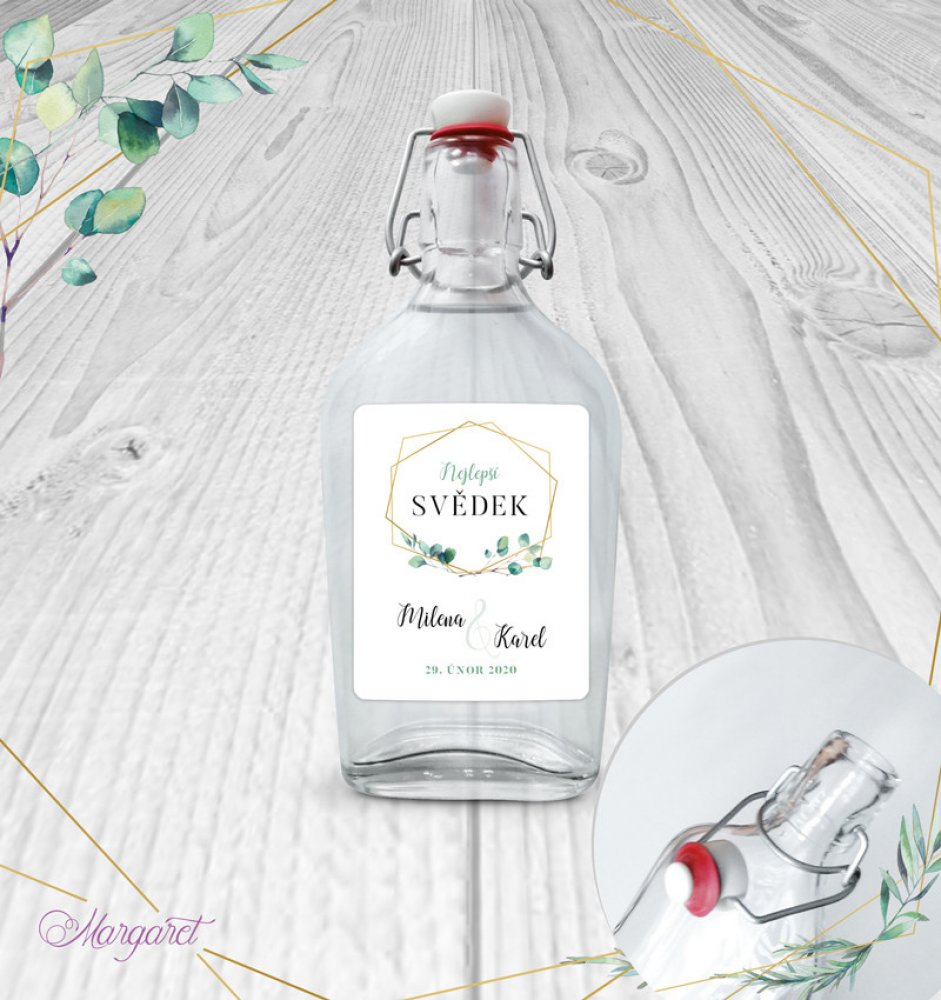 Skleněná láhev s pákovým uzávěrem, etiketa na samolepícím papíře s vyšší gramáží.