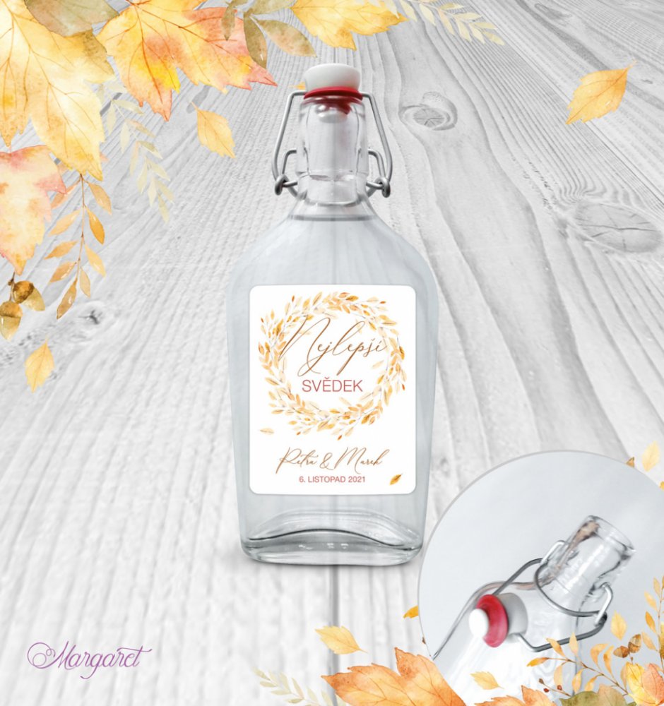 Skleněná láhev s pákovým uzávěrem, etiketa na samolepícím papíře s vyšší gramáží.