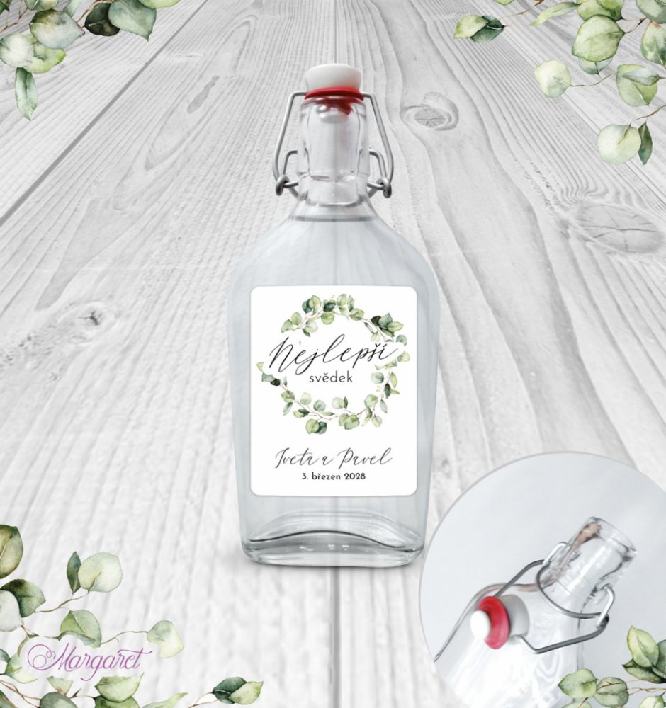 Skleněná láhev s pákovým uzávěrem, etiketa na samolepícím papíře s vyšší gramáží.