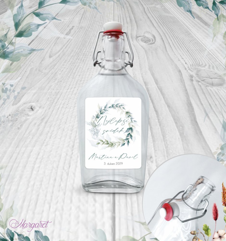 Skleněná láhev s pákovým uzávěrem, etiketa na samolepícím papíře s vyšší gramáží.