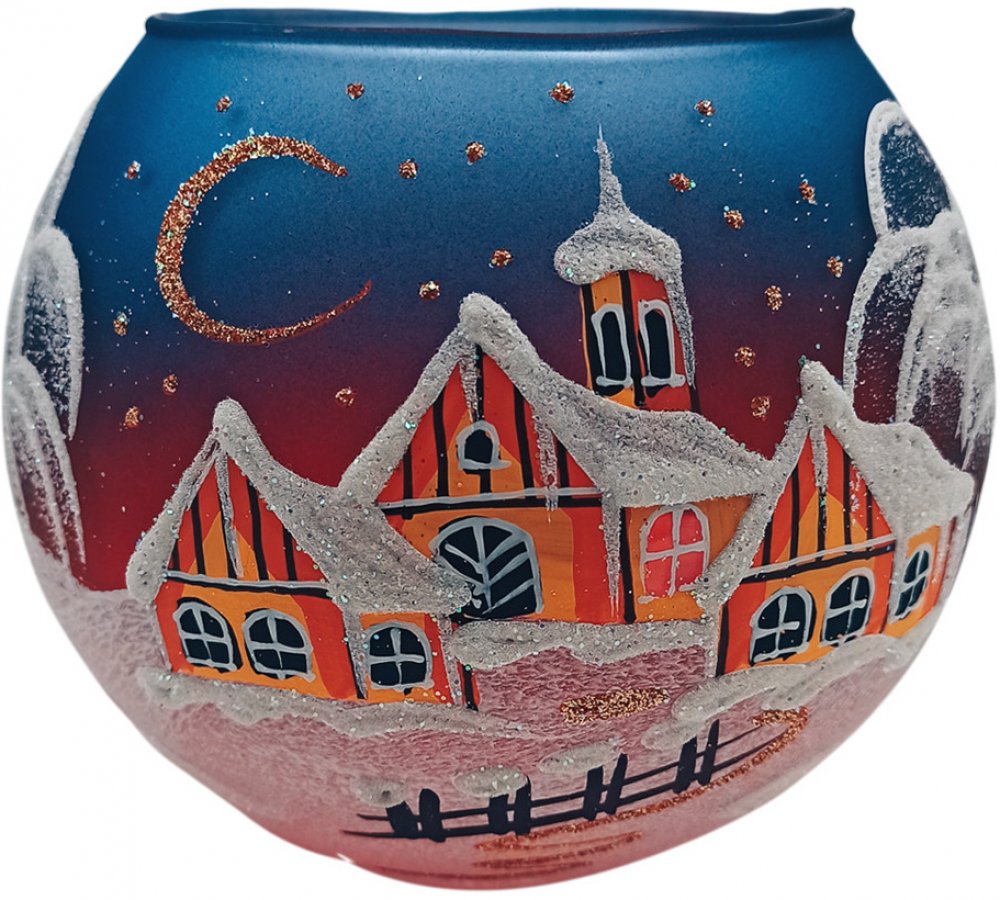 Skleněné akvárium na svíčku ručně malované s motivem zasněžené chaloupky. Průměr je 12 cm. Vhodný na čajovou svíčku.