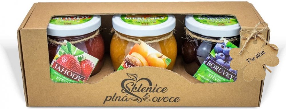 Sklenice plná ovoce Dárek "pro štěstí" - 3 džemy slazené stévií 600 g jahoda borůvka malina