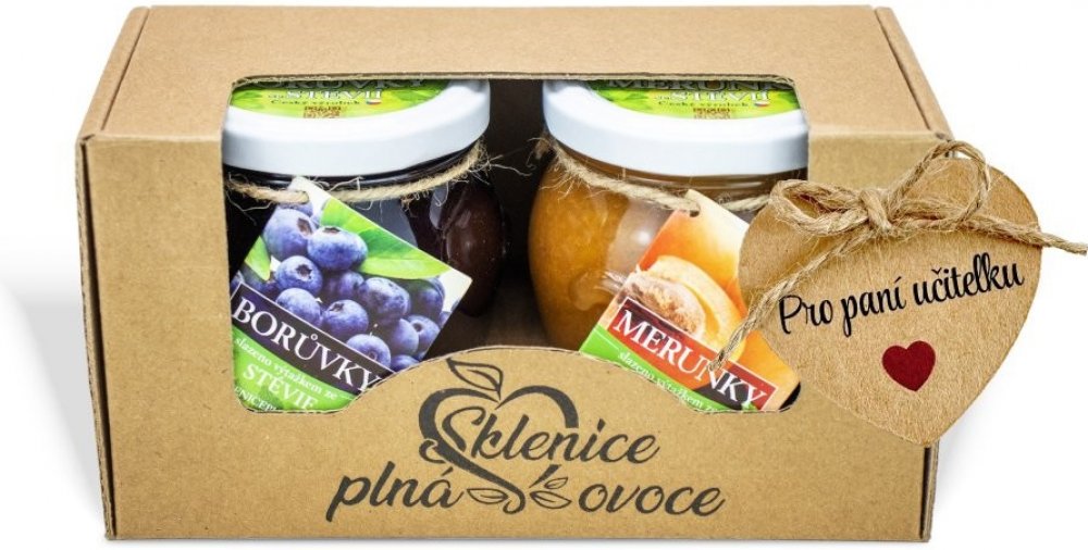 Sklenice plná ovoce Dárek s visačkou pro paní učitelku - 2 džemy slazené stevií 400g meruňka višeň