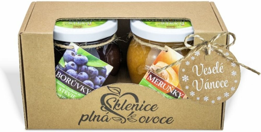 Sklenice plná ovoce Dárek s visačkou Veselé Vánoce - 2 džemy slazené stevií 400 g borůvka malina
