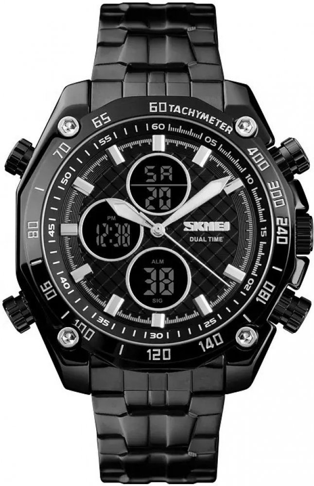Skmei kombinované ocel sportovní pánské bateriové - quartz ocel bateriové 155 g minerální 22 cm bez osazení kulaté černá černá s luminiscencí skládací spona 2 cm na ruku s geometrickým vzorem bez číslic černá ocel pevná ocel s dočasným svícením (luminiscence/LED) s nenáročnou údržbou (quartz) bez chytrých funkcí