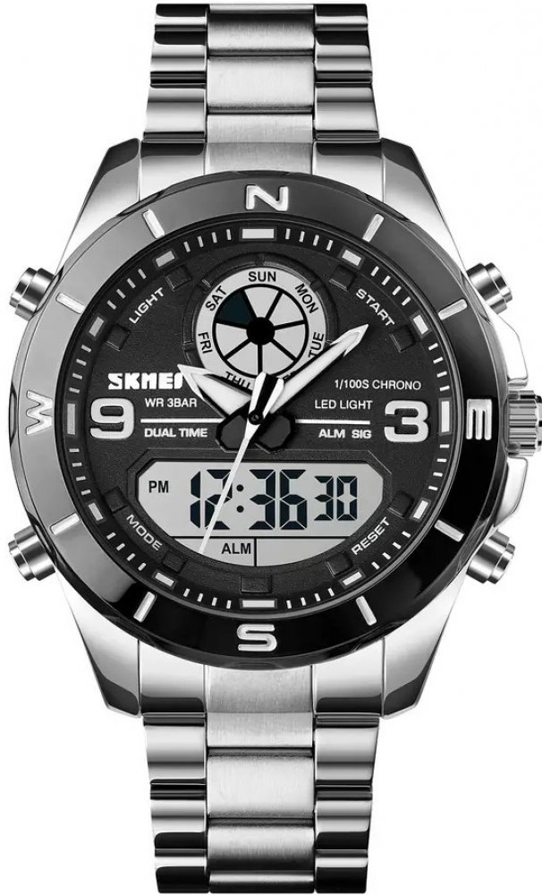 Skmei kombinované ocel sportovní pánské bateriové - quartz ocel 3.0 m bateriové 153 g minerální 23 cm bez osazení kulaté stříbrná černá s LED diodou sklapovací přezka 2 cm na ruku bez číslic stříbrná ocel pevná ocel s dočasným svícením (luminiscence/LED) s nenáročnou údržbou (quartz) bez chytrých funkcí