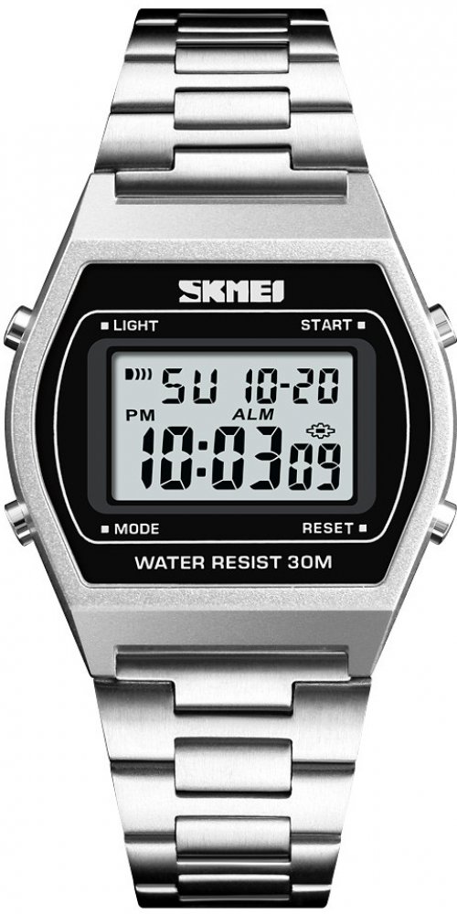 Skmei digitální ocel vintage pánské bateriové - quartz pro běžné použití (30–50 m) ocel 30.0 m bateriové 46 g plastové obdélníkové stříbrná černá s LED diodou skládací spona 1.4 cm na ruku stříbrná ocel s dočasným svícením (luminiscence/LED) s nenáročnou údržbou (quartz) bez chytrých funkcí
