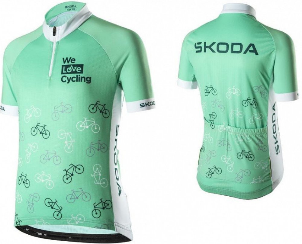 Dětský cyklistický dres v novém designu Škoda v kombinaci barev electric a emerald je vyrobený z recyklovaných materiálů. Na dresu je tištěn dětský motiv kol. Poloviční zip usnadňuje oblékání přes hlavu. Dres je vybaven dvěma elastickými kapsami vzadu. Elastické rukávy se přizpůsobí paži. Kontrastní bílý límec. Dres má tištěné logo Škoda na zádech a na bocích a logo We Love Cycling na srdci.