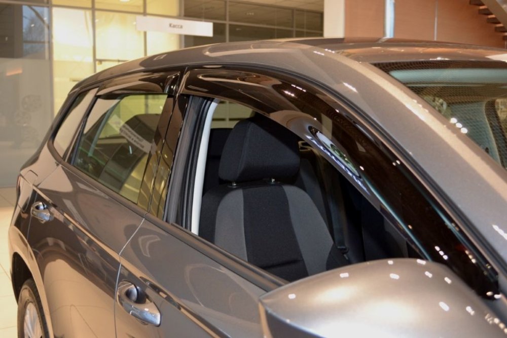 Protiprůvanové plexi, ofuky oken či chcete-li deflektory jsou určeny pro daný model vozu. Umožňují u stojícího vozidla ponechání pootevřených oken i za nepříznivého počasí. Při jízdě s pootevřeným či otevřeným oknem zabraňují nepříjemnému proudění vzduchu na cestující. V neposlední řadě se jedná o designový doplněk pro každý vůz. Ofuky pro Škoda model Karoq jsou vyrobeny v elegantním kouřově zatmaveném provedení.