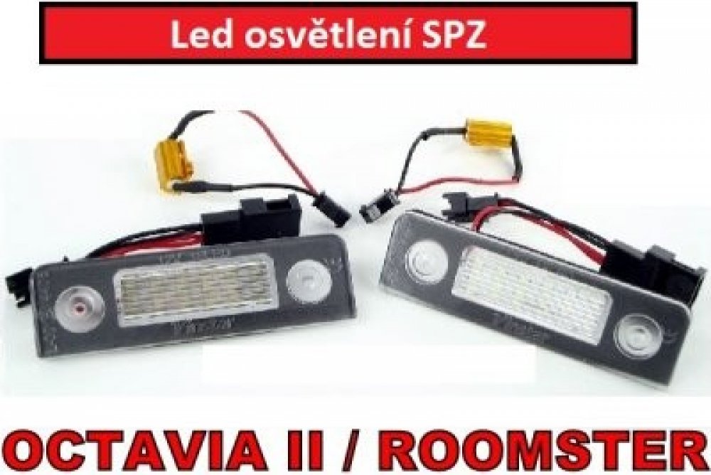 Led osvětlení SPZ Škoda Octavia II, Roomster Nahrazuje původní osvětlení SPZ, netrpí povětrnostními vlivy na zádi vozidla, LED jsou kompatibilní s CAN sběrnicí vozu (nenačítají chybová hlášení). Osvětlení má již vestavěny odporové rezistory, díky kterým palubní počítač nevyhodnocuje chyby Rozměry výrobku D x Š x rozteč montážních děr Jednoduchá výměna, pouze náhrada za původní osvětlení Homologováno E Každé světlo obsahuje 18 SMD diod Výroba EU Určeno pro vozidla:Octavia II Liftback, Combi 2008-2013 verze vozidla po FaceliftuRoomster 2006-2010