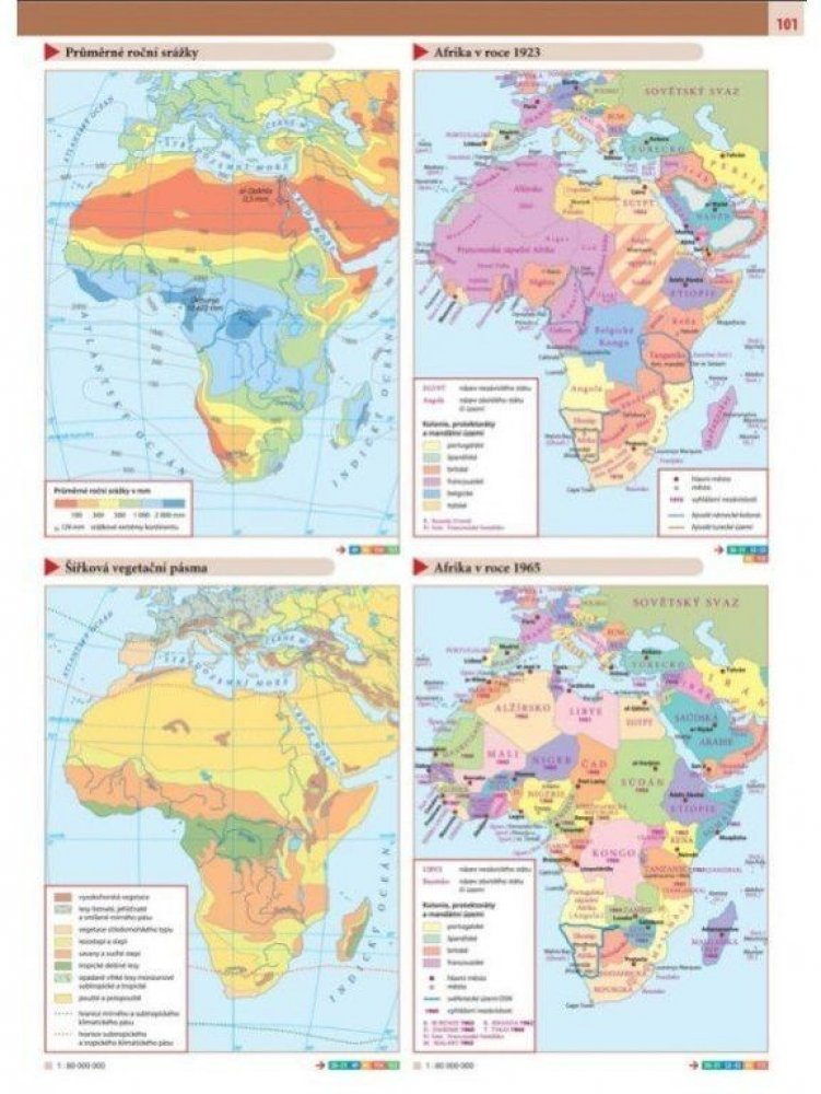 Části věnované jednotlivým světadílům obsahují podrobné obecně zeměpisné mapy, doplněné o rozšiřující tematické mapy. Zeměpisné učivo je doplněno také o historické mapy stěžejních etap vývoje jednotlivých kontinentů, umožňující využití také v mezipředmětové výuce.