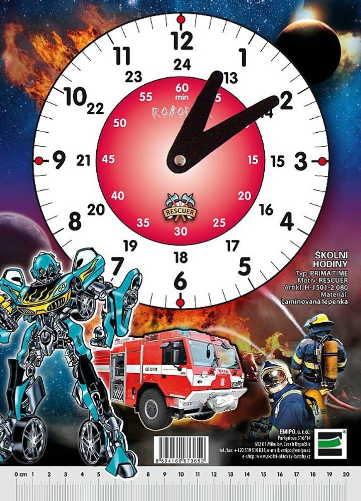 Školní hodiny slouží k výuce času prvňáčkům základních škol. Ve spodní části hodin je pravítko, které se může odstřihnout a používat samostatně.