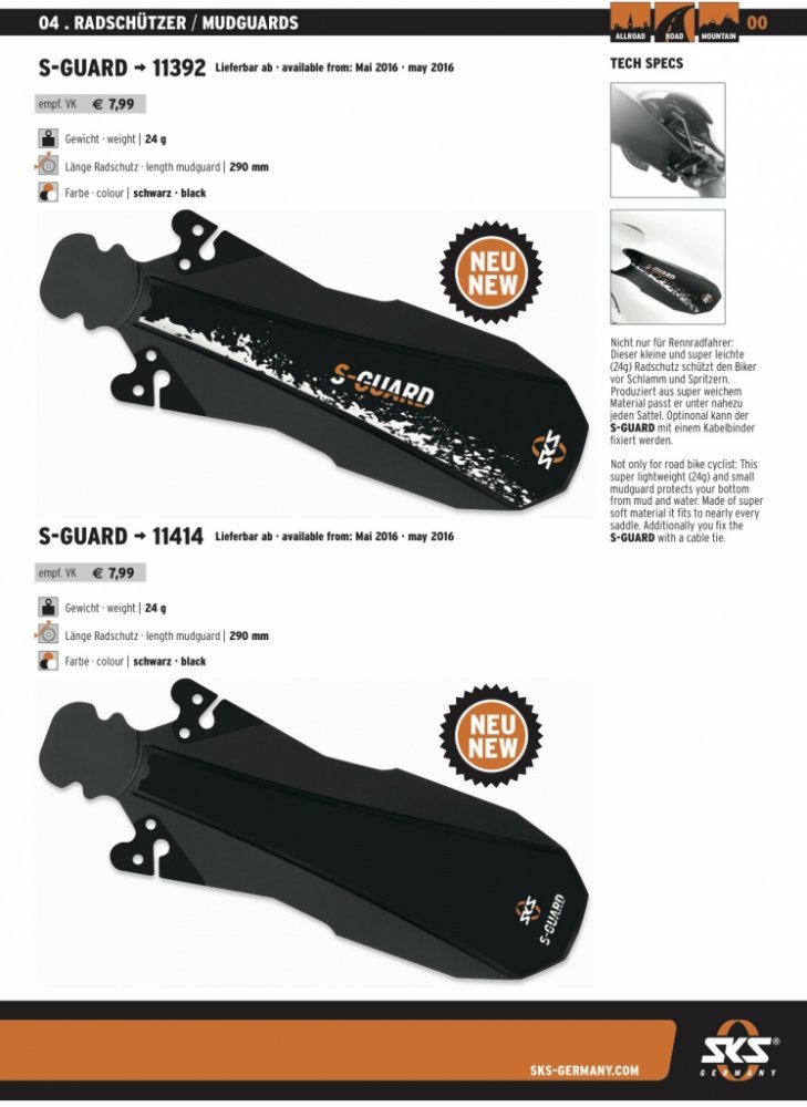 SKS S-Guard je černý, zadní blatník nejen pro cyklisty na silničních kolech, ale je vhodný i pro celoodpružená kola. Tento velmi lehký (24 g) a malý blatník vás chrání před bahnem a vodou. Vyrobeno z velmi měkkého materiálu, který se hodí téměř ke každému sedlu. Navíc jej můžete zafixovat pomocí přiložené s-pásky. Rychloupínací s montáží na ližiny sedla.