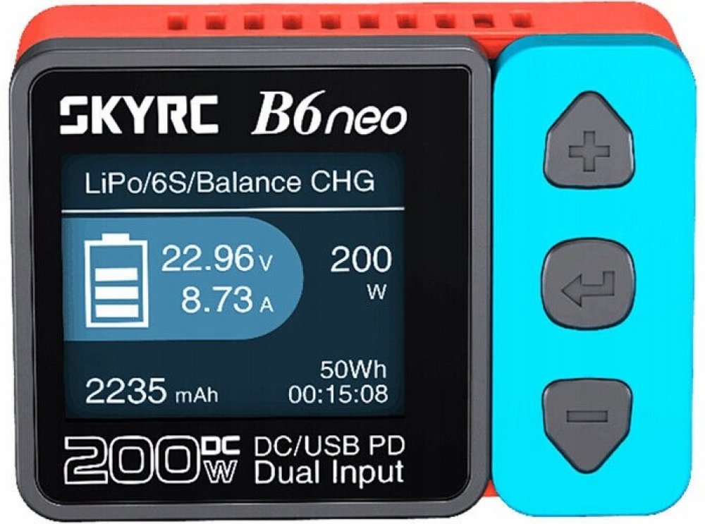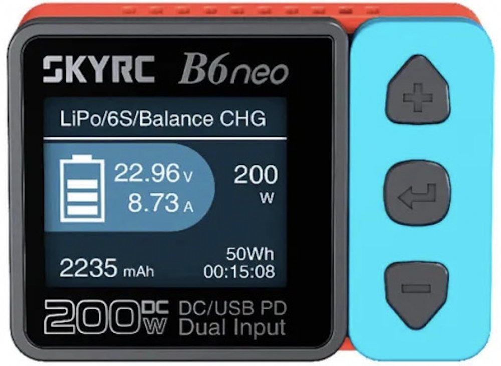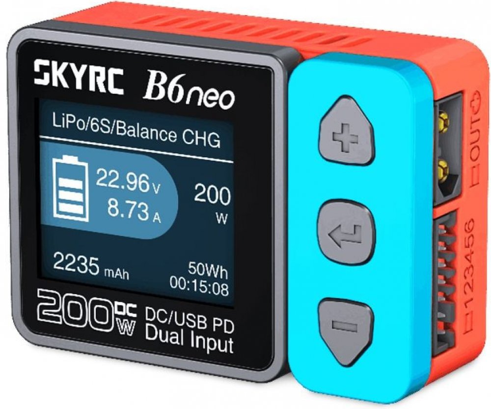 B6neo is a compact charger with great power. Despite its small size, it is capable of delivering up to 200W of power when charging connected to DC power. In addition, it can act as a digital power source, offering adjustable voltage from 5 to 27V and current from 1 to 10A. The ColorX interface, built-in safety features and easy firmware updates through the dedicated Charger Master app, make the B6neo a charger suited to today's needs. Safety, power and convenience are what set SkyRC's product apart.