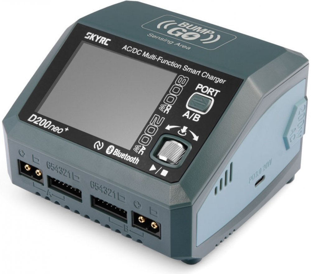 Dvoukanálový rychlonabíječ s balancery pro 4-15 čl. NiCd/NiMH, 1-6 čl. LiPo/Li-ion/LiFe/ LiHV, 6/12/24V Pb a bezúdržbové Pb AGM proudem 0,1-20A (max. 2x400W). Vybíjení 0,1-2,0A (max. 2x10W). Napájení 12 V/230 V. Měření vnitřního odporu, USB port, možnost použití obou kanálů jako stabilizovaného zdroje 5-27 V/max. 15A. Nabíjecí USB C port, Bluetooth 5.0 pro komunikaci s aplikací SkyCharger. Podporuje BumpGO funkci.