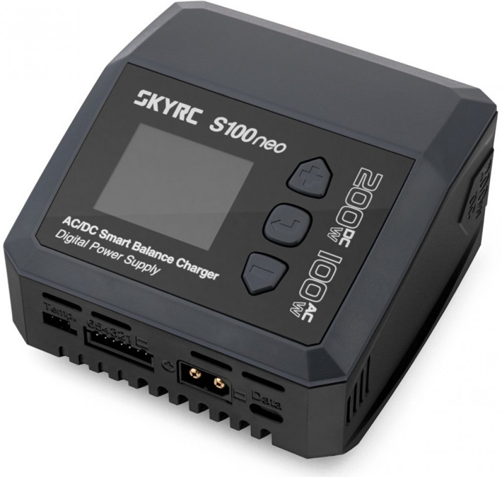 SKY RC S100neo nabíječ SKY RC. Nabíječe a příslušenství. Malý, ale výkonný mikroprocesorový rychlonabíječ s balancerem pro 1–15 čl. NiCd/NiMH, 1–6 čl. LiPo/Li-ion/LiFe/LiHV, 6/12/24V Pb proudem 0,2–12A (max. 200W/max. 100W při napájení ze sítě). Vybíjení 0,1–2A (max. 5W). Napájení 6–30V nebo 100–240V/50–60Hz. Měření vnitřního odporu, režim stabilizovaného zdroje 2–27V/1-10A, záběh stejnosměrných motorů.