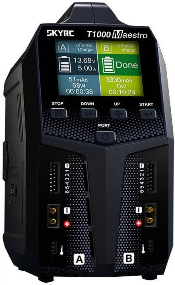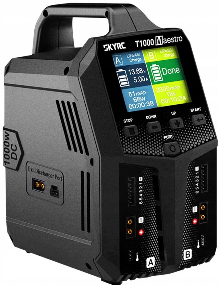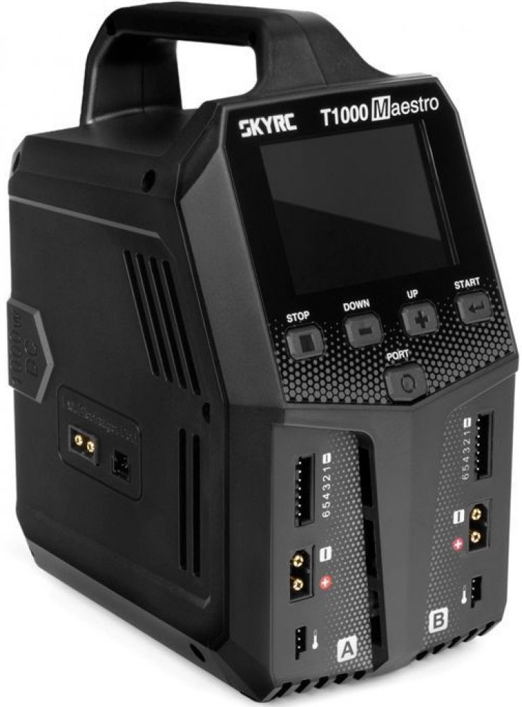 Dvoukanálový nabíječ SKY RC T1000 Maestro 1000W byl konstruován se snahou poskytnout vše potřebné pro nabíjení dvou akumulátorů velkými proudy současně „pod jednou střechou" včetně síťového zdroje a s jednoduchou obsluhou. T1000 umožňuje nabíjet a vybíjet běžné typy článků (NiCd, NiMH, Li-poly, Li-ion, Li-Fe, Li-HV, Pb), navíc jsou oba kanály vybaveny vestavěnými šestikanálovými balancery, které zajišťují velmi bezpečné a komfortní nabíjení lithiových akumulátorů. Může také pracovat v režimu paralelního nabíjení, kdy oba kanály nabíjejí jeden akumulátor proudem 20-35 A. Při připojení externího vybíječe BD350 potom umožňuje vybíjení proudem až 40 A při max výkonu 350 W.