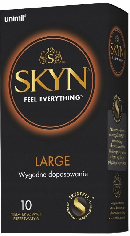 Skyn Large jsou nelatexové kondomy od značky Unimil. Jemné a pohodlné s dlouhotrvajícím hydratačním přípravkem. Jsou delší a širší než standardní kondomy. Nominální šířka: 56 mm.