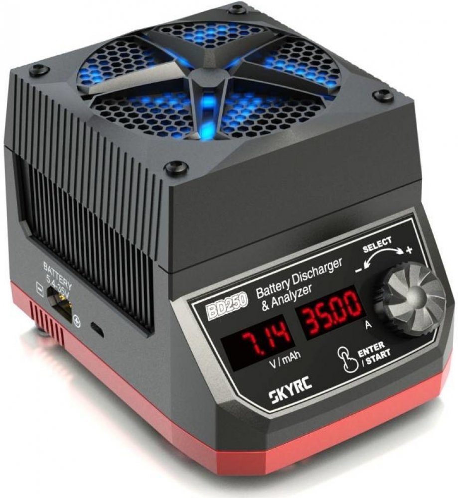 SkyRC BD250 umožňuje testovat baterie jakéhokoli typu s napětím 5,4 V až 35 V. Zařízení má vestavěný ventilátor, který je součástí pokročilého chladicího systému, zajišťujícího optimální provoz zařízení i při vybíjení na plný výkon.
