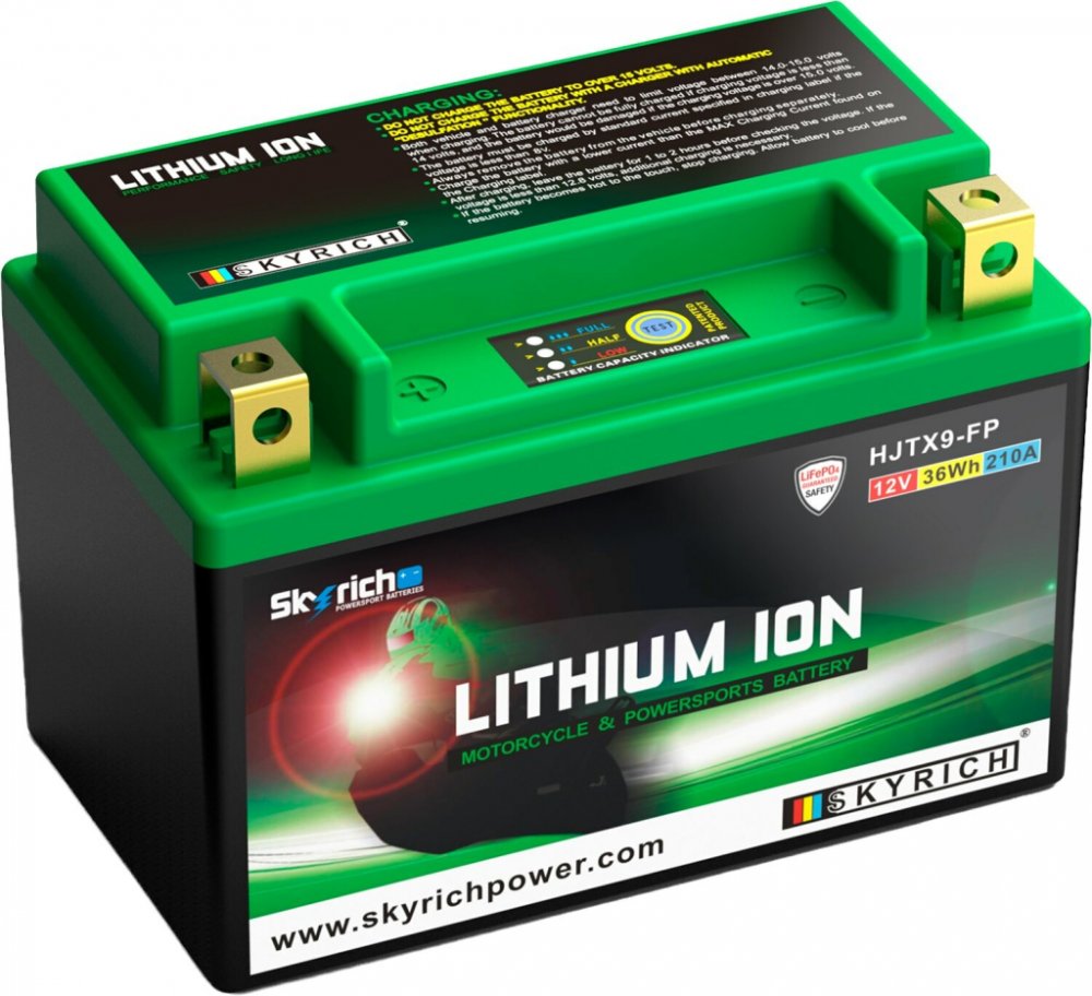 Všechny motocyklové startovací lithiové (LiFePO4) akumulátory výrobce Skyrich mají až 40 násobně větší vybíjecí proud než je jejich kapacita. Z důvodu použití lithiové technologie jsou motobaterie Skyrich Lithium až o 66% lehčí než tradiční olověná baterie a dosahuje životnosti až 2000 cyklů nabití. Každá motobaterie značky Skyrich má nízké samovybíjení. Skladovatelnost je až 1 rok při teplotě do ...
