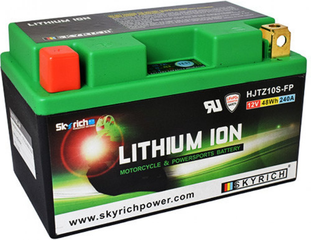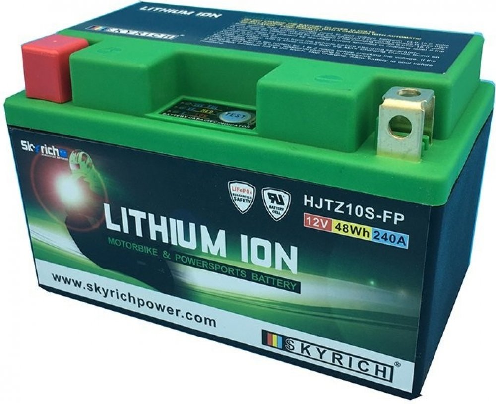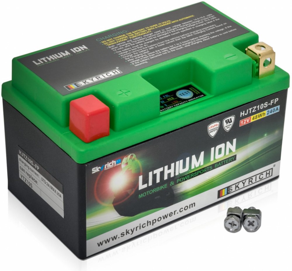 Popis: Všechny motocyklové startovací lithiové (LiFePO4) akumulátory výrobce Skyrich mají až 40 násobně větší vybíjecí proud než je jejich kapacita. Z důvodu použití lithiové technologie je motobaterie až o 66% lehčí než tradiční olověná baterie a dosahuje životnosti až 2000 cyklů nabití. Každý moto-akumulátor LiFePO4 značky Skyrich má nízké samovybíjení. Skladovatelnost je až 1 rok při teplotě do 25°C. Výrobce doporučuje pravidelné nabíjení minimálně jednou za 6 měsíců. Akumulátor je možné nabíjet jak nabíječkou určenou pro LiFePO4, tak i nabíječkou určenou pro bezúdržbové akumulátory. Tím odpadá nutnost koupě nové nabíječky. Použitá nabíječka nesmí mít funkci automatické desulfatace! Velikou výhodou proti bezúdržbovým akumulátorům je výše nabíjecího proudu. V případě nutnosti je možno nabíjet až 10x vyšším proudem, než je kapacita baterie. Tímto způsobem je možné motobaterii plně nabít za přibližně 6 minut. Akumulátor je použitelný v jakémkoli motocyklu. Když je nabíjecí napětí naprázdno v rozmezí 14,0V - 15,0V, NENÍ nutná žádná úprava nabíjecího systému a instalace motocyklu. Lithiové akumulátory Skyrich LiFePO4 jsou známé svými malými rozměry. Dodávají se s distančními podložkami pro uzpůsobení jakémukoli bateriovému prostoru v motocyklu. Při správném používání nehrozí riziko výbuchu nebo požáru, jako je tomu u jiných lithiových akumulátorů. Akumulátor je šetrný k životnímu prostředí, protože neobsahuje jedovaté kovy jako olovo, rtuť či kobalt. Neobsahuje ani kyselinu sírovou, jako je tomu u olověných akumulátorů, a proto je použitelný v jakékoli poloze, včetně "vzhůru nohama". Akumulátor se dodává naplněný, přednabitý, připravený k okamžitému provozu.
