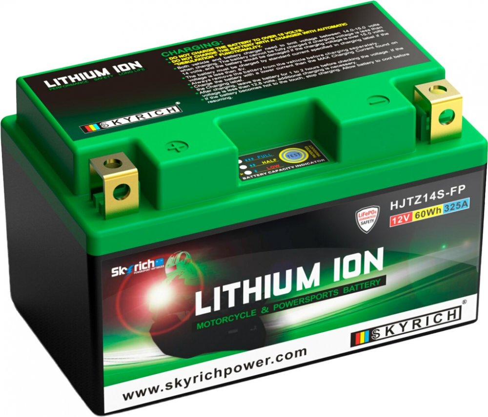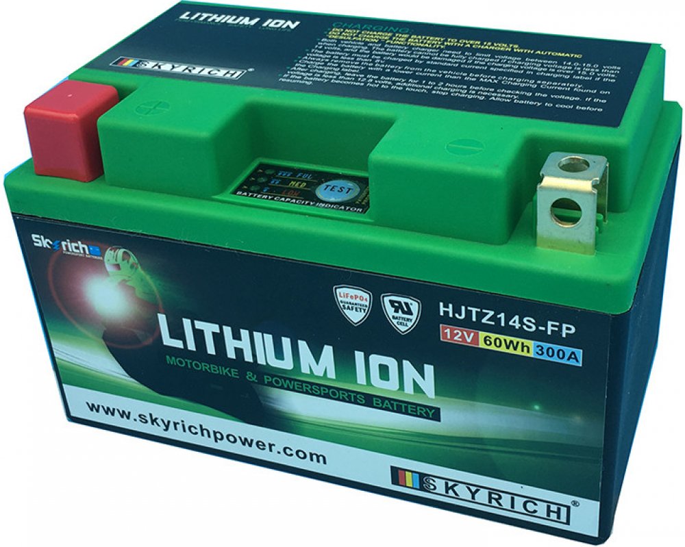 Lithiové akumulátory Skyrich LiFePO4 jsou známé svými malými rozměry. Dodávají se s distančními podložkami pro uzpůsobení jakémukoli bateriovému prostoru v motocyklu. Při správném používání nehrozí riziko výbuchu nebo požáru, jako je tomu u jiných lithiových akumulátorů. Akumulátor HJTZ14S-FP je šetrný k životnímu prostředí, protože neobsahuje jedovaté kovy jako olovo, rtuť či kobalt. Neobsahuje ani kyselinu sírovou, jako je tomu u olověných akumulátorů, a proto je použitelný v jakékoli poloze, včetně "vzhůru nohama". Akumulátor se dodává naplněný, přednabitý, připravený k okamžitému provozu.