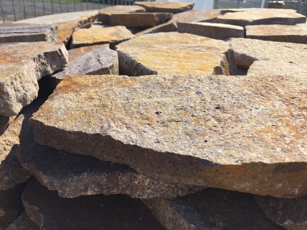 Dlažba - typ horniny: porfyr štípaný - nepravidelné tvary: tloušťka 3-5 cm, velikost 10-40 cm. Jedná se o velmi kvalitní přírodní kámen vhodný zejména k dláždění chodníků a cest kolem vašeho domu. Je možno ho použít i na suché zdění. Baleno po 23 m2 (pro zasílání kurýrní službou rozdělujeme na 2 palety) Kámen je vysoce mrazuvzdorný. V případě pochozí dlažby ho doporučujeme usadit pouze do pískového štěrkového lože. V případě větších zátěží do maltového nebo betonového lože NVL 300 Quick mix. Vhodný technologický postup vám na požádání zašleme. Barva rezavo hnědá. Baleno po 23 m2. Jedná se čistě o přírodní materiál nepravidelných tvarů, tudíž 1 m2 dlažby/obkladu se vždy rozumí 1 ucelená řada produktu na paletě. Při použití se spárou užší než 2-4 cm, případně tzv. na sraz, je potřeba zakoupit o 10-20% produktu více, proti požadované finální výměře.
