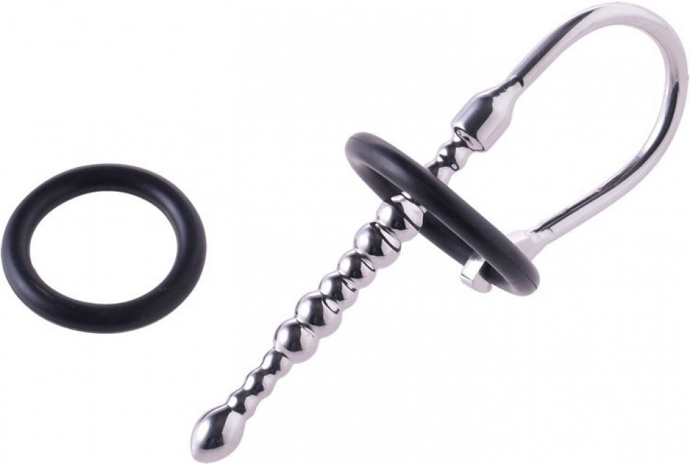 Dlouhý ocelový penis plug s vyměnitelnými silikonovými kroužky okolo žaludu. Celková délka 113 mm, použitelná délka 90 mm, průměr 6–8 mm. Vnitřní průměry kroužků 25 a 30 mm.