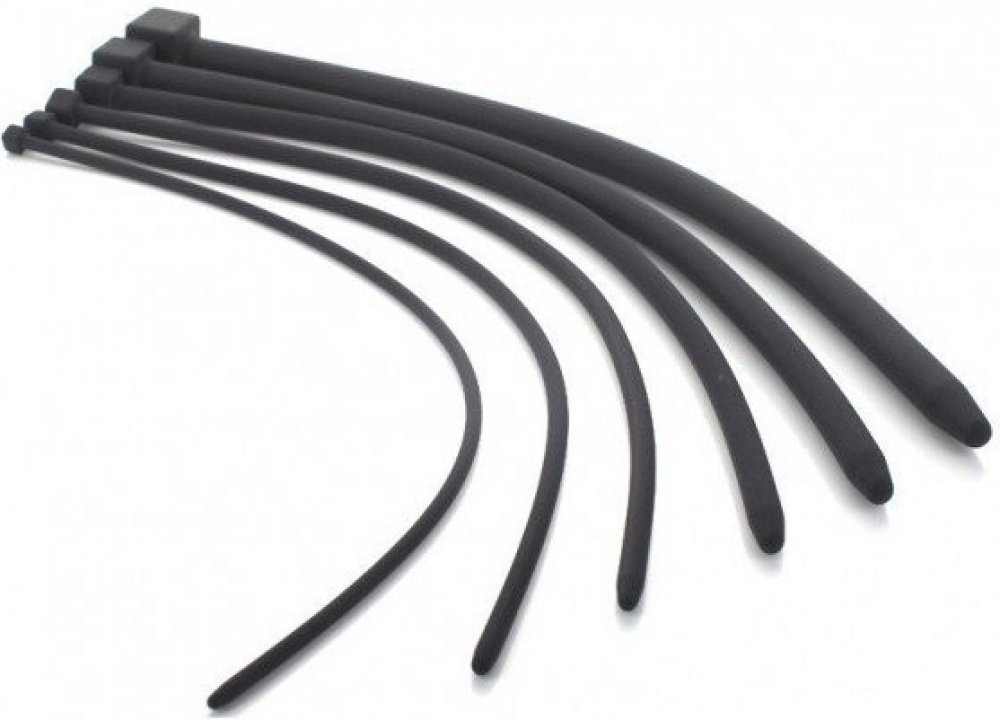 Dlouhý ohebný dilatátor vyrobený z černého silikonu. Celková délka 350 mm, průměr 4,5 mm.