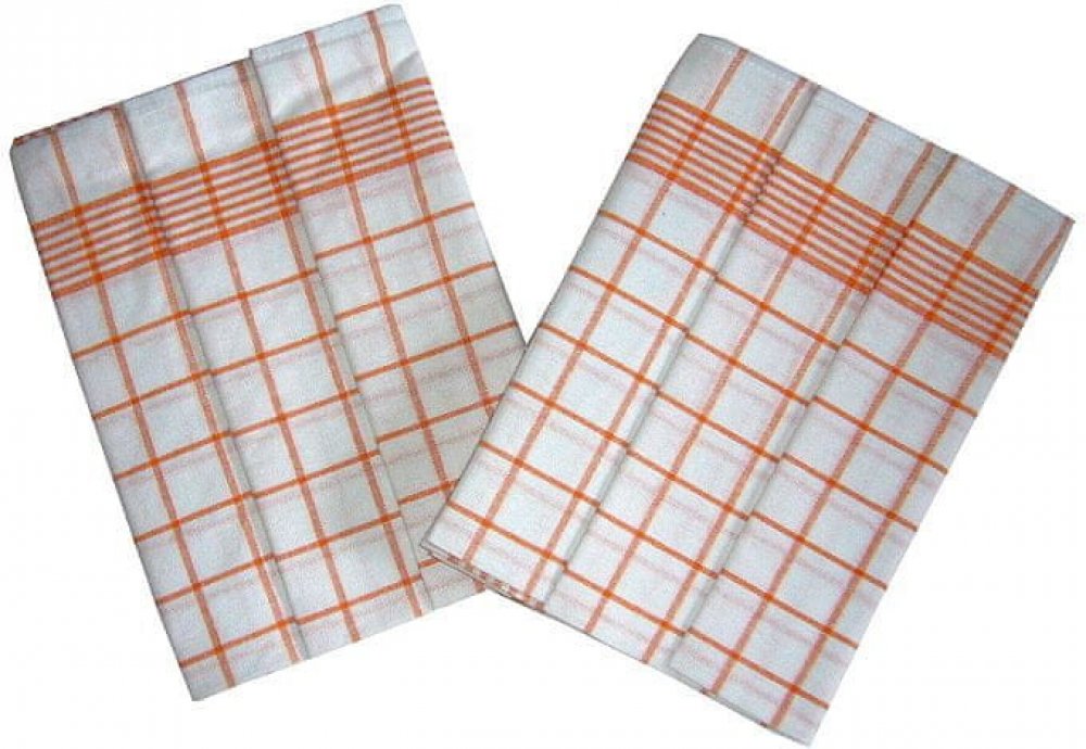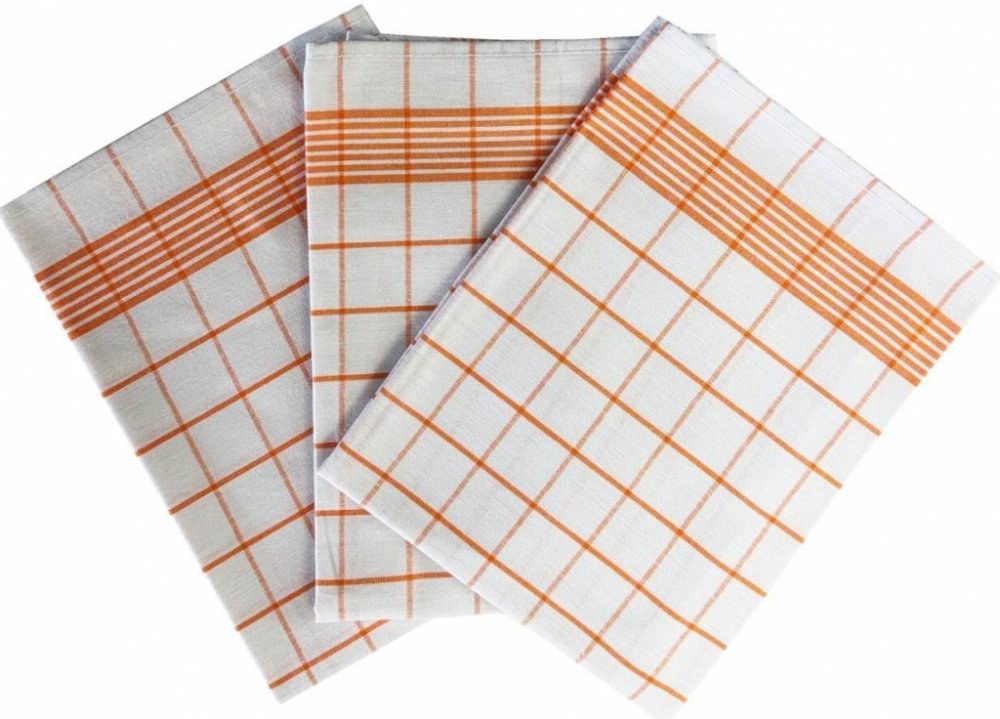 Sada tří bavlněných utěrek s kostkami - kombinace barev bílá a oranžová.