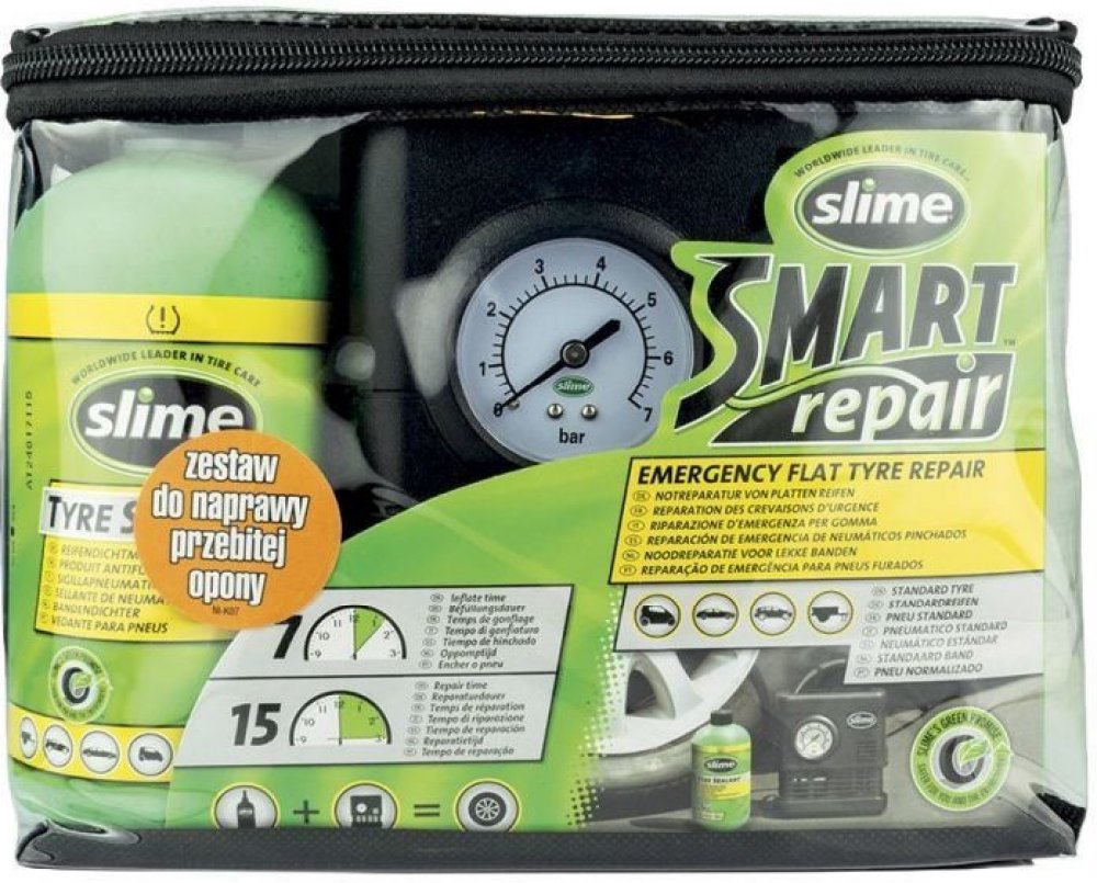 Poloautomatická opravná sada defektu SMART REPAIR od americké společnosti Slime.Poloautomatická opravná sada Slime Smart Repair je patentovaný systém umožňující opravit prázdnou pneumatiku a to pouze za 15 minut a tím minimalizovat čas strávený na nebezpečné silnici. Již není nutné čekat na odtah, nebo spoléhat na nebezpečné aerosolové huštění pneumatik.Jak Slime funguje?Jak se pneumatika opravená...