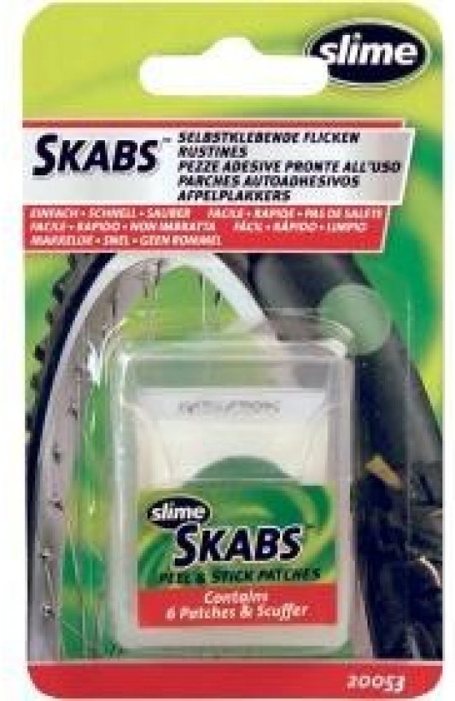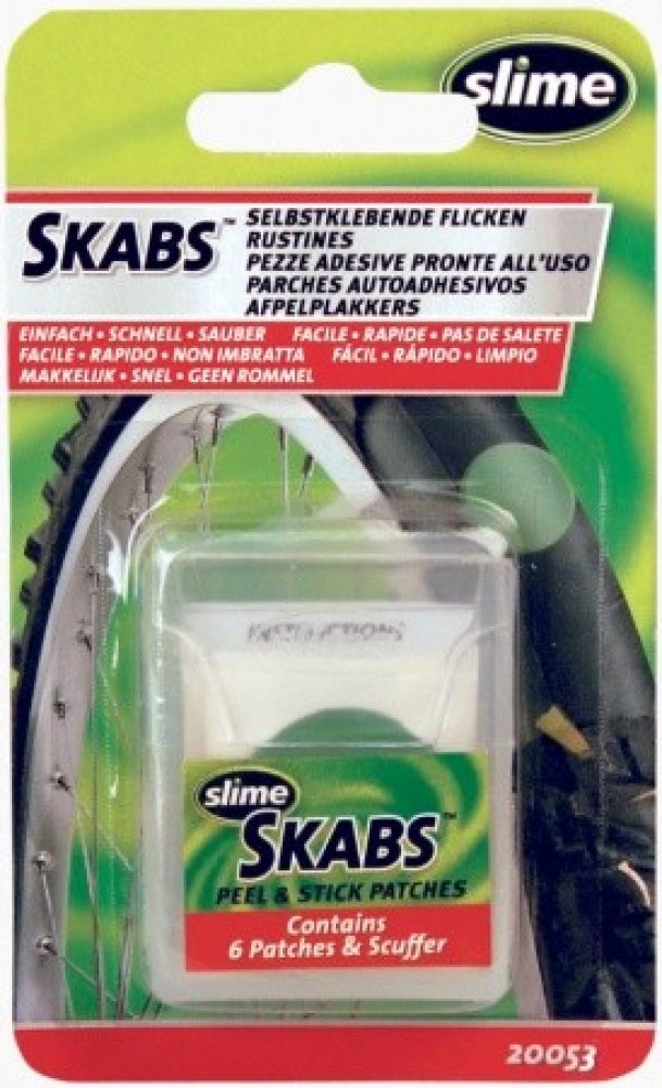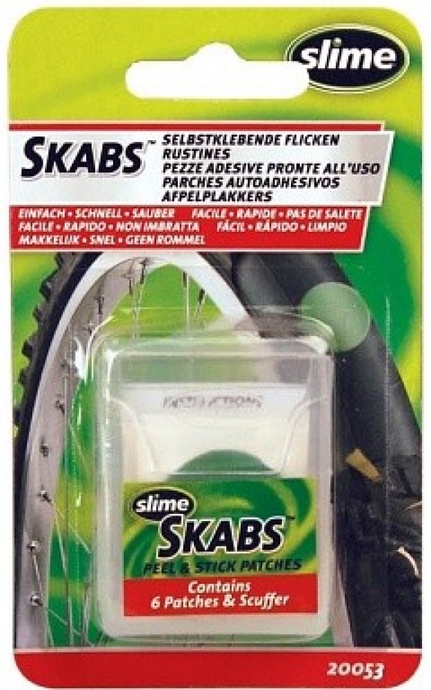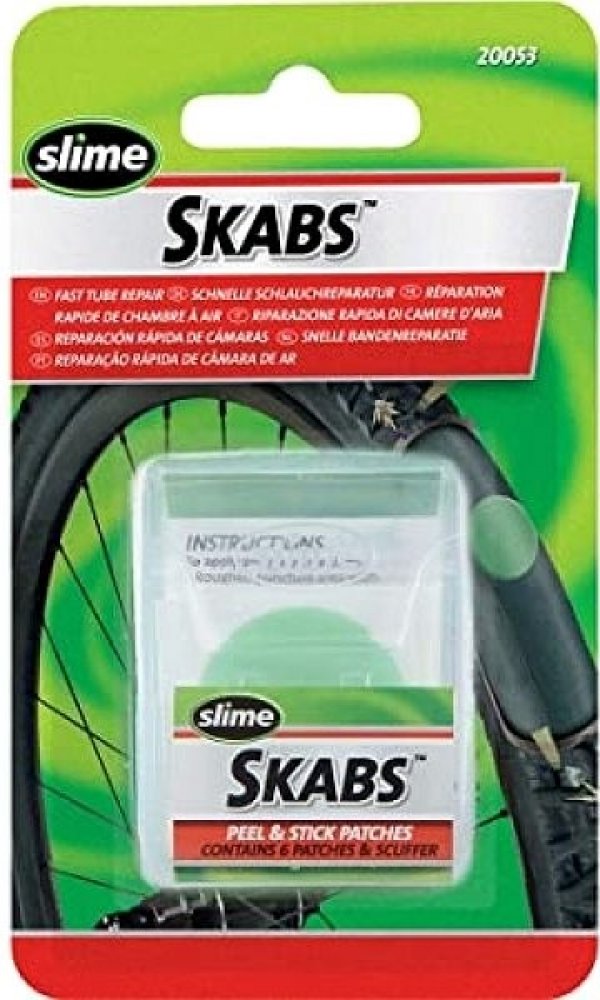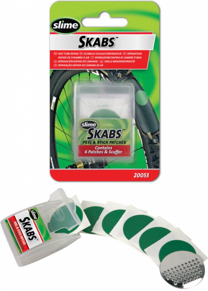 Samolepící záplaty SKABS pro rychlou opravu pichlé cyklo duše. Jendoduchá aplikace, velmi rychlá oprava defektu. Balení je ideální do kapsy dresu či ledvinky.