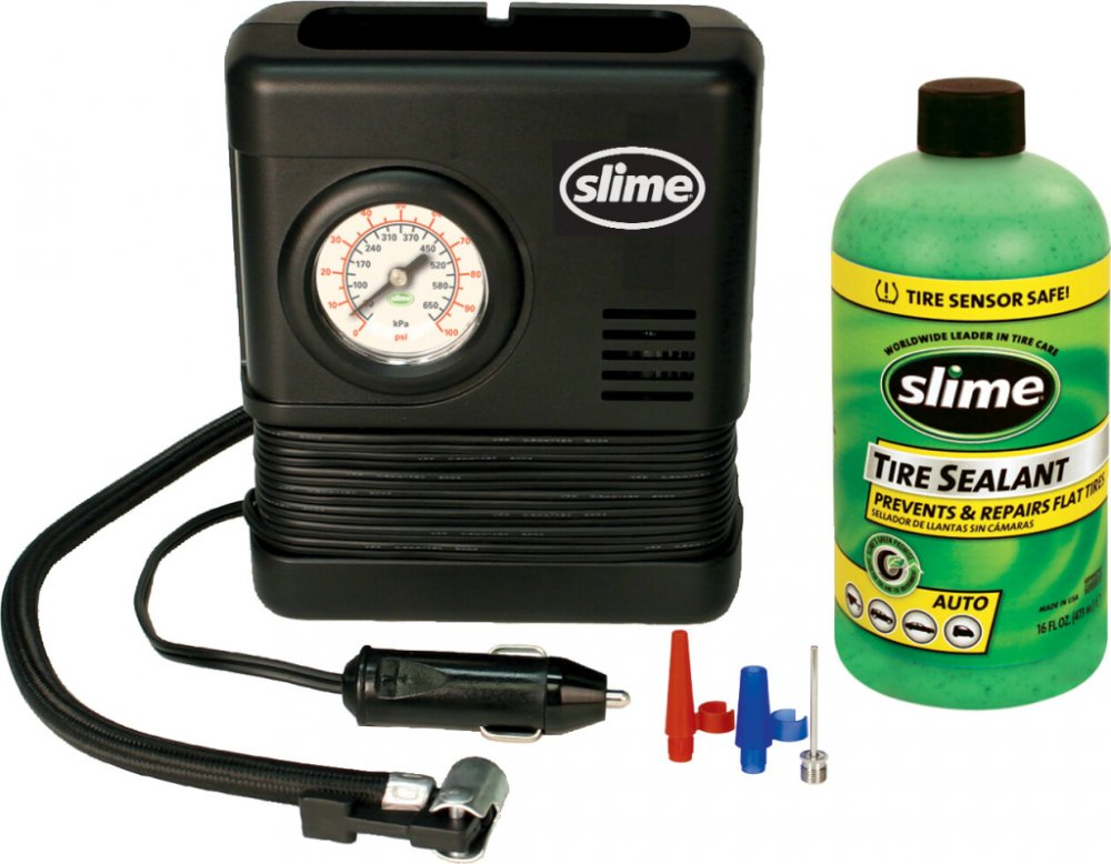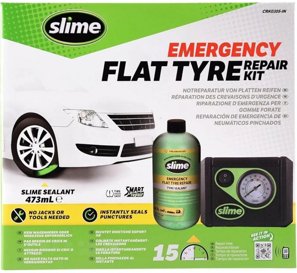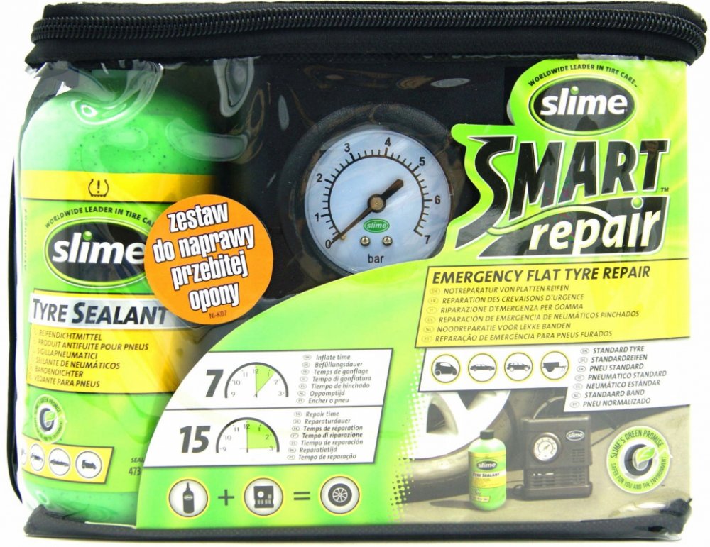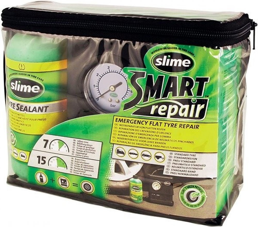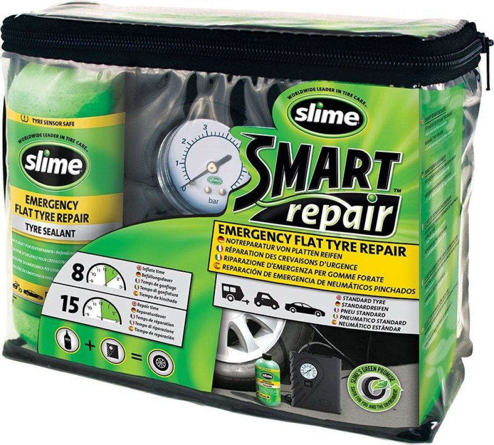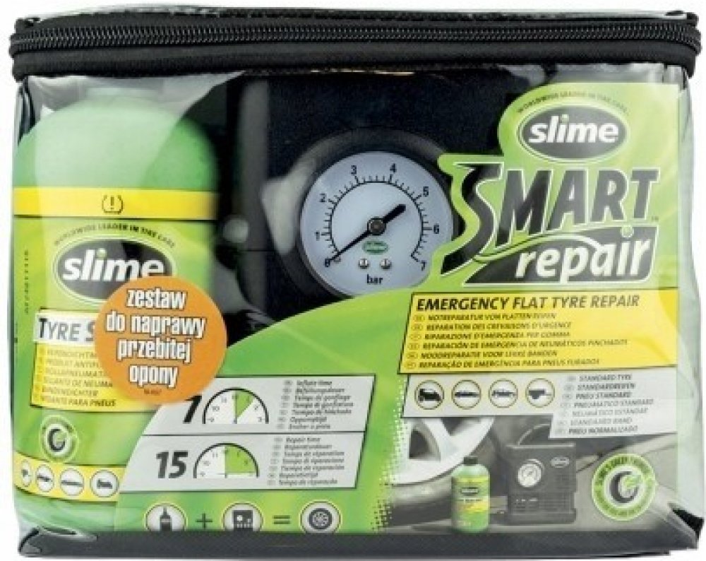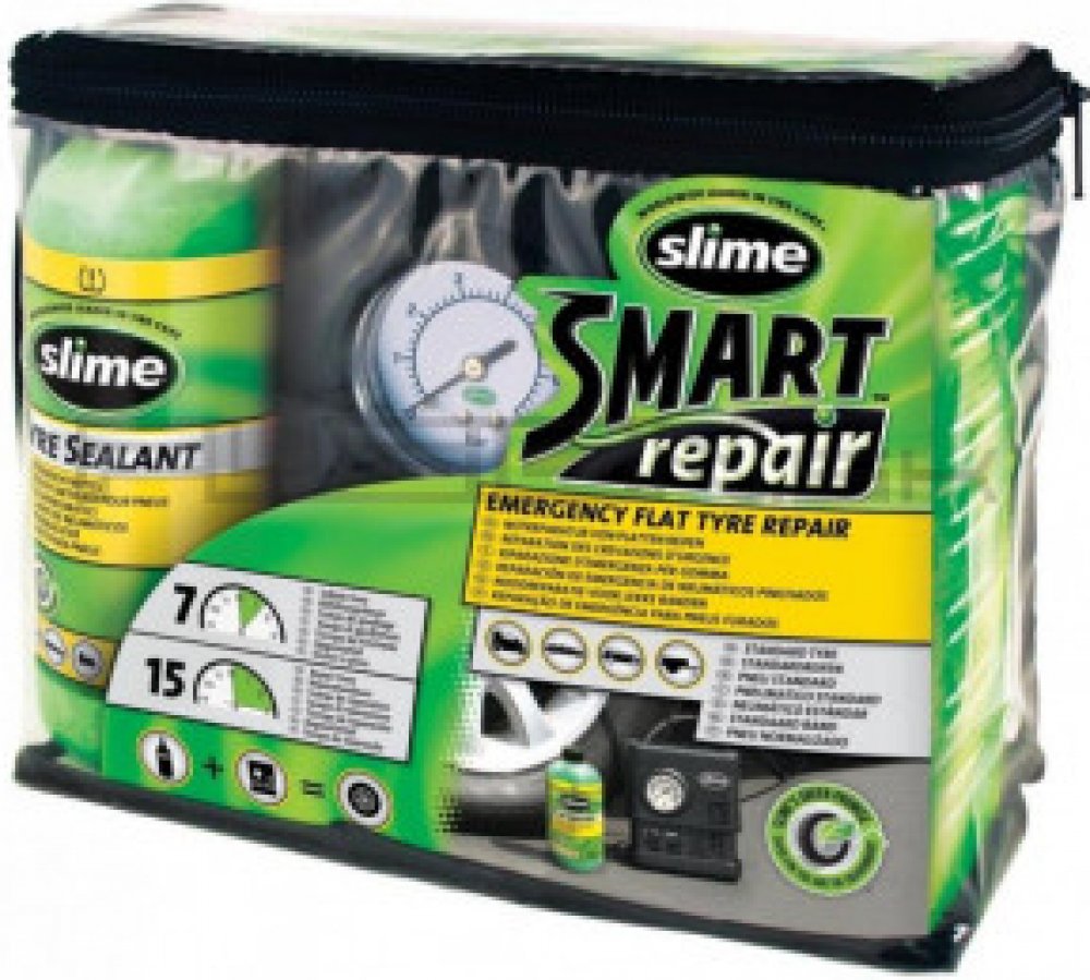 Poloautomatická opravná sada Slime Emergency Flat Tyre Repair Kit je patentovaný systém umožňující opravit prázdnou pneumatiku a to pouze za 15 minut a tím minimalizovat čas strávený na nebezpečné silnici. Již není nutné čekat na odtah, nebo spoléhat na nebezpečné aerosolové huštění pneumatik! Slime je také bezpečný pro použití s TPMS senzory. Když používáte Slime, tak není nutné zvedat ani demont...
