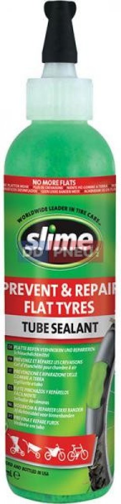 SLIME Těsnící prostředek na pneumatiky, 237mlTmel je určen pro rychlé opravy silničních pneumatik. Slime pneu utěsňovač a prevence průpichů je testován pro použití ve všech pneumatikách. Po aplikaci zůstává Slime stále kapalný a neztvrdne či nevyschne. V otáčející se pneu při jízdě tlačí odstředivá síla zelený tmel Slime na plochu běhounu a vytváří tak ochranou vrstvu, která okamžitě po jakémkoliv průpichu do velikosti 6 mm do otvoru vnikne a ten následně utěsní. Slime tmel zůstává po aplikaci do pneu AKTIVNÍ (živý) ještě 2 roky. Tekutina je stále a