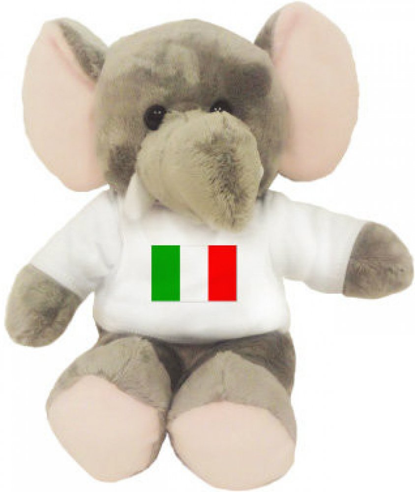 Italia – Itálie, Italy, Italien, Italia, vlajka vašeho oblíbeného státu bude skvěle vypadat na tričku, ale i polštáři či kravatě.. Plyšový slon s tričkem na které vám vyhotovíme potisk podle vašich představ. Je omyvatelný a sedící výška slona je 21cm. Není vhodné pro děti do 3 let