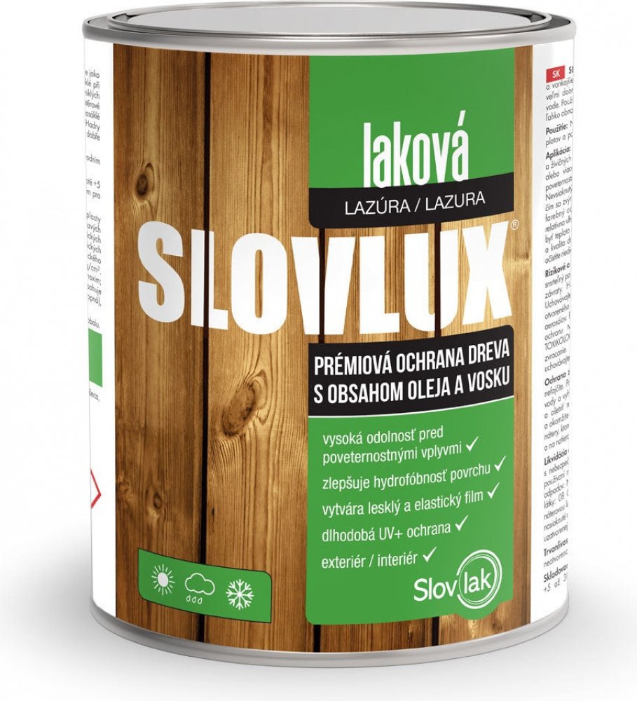 Slovlak SLOVLUX laková lazura na dřevo je roztok speciálních alkydových pryskyřic a bezaromátového benzínu s přídavkem vosku, aditiv a transparentních pigmentů. Na povrchu vytváří hrubší, hladkou, pololesklou až lesklou vrstvu, která zajišťuje dlouhodobou ochranu dřeva proti působení vlhkosti, povětrnostním vlivům a UV záření. Slovlux laková lazura je vysoce kvalitní ochranná a dekorativní nátěrov...