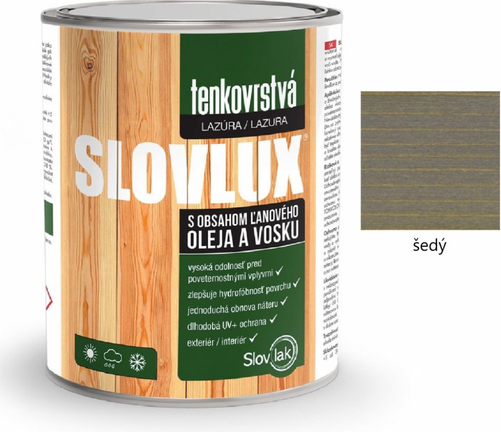 Slovlak SLOVLUX tenkovrstvá lazura na dřevo s obsahem lněného oleje a vosku, je určena pro vnitřní a vnější použití. Lazura proniká hluboko do struktury dřeva a vyznačuje se velmi dobrou odolností vůči povětrnostním vlivům a odpuzuje vodu. Použité speciální pigmenty snižují vliv UV záření. Slovlak SLOVLUX tenkovrstvá lazura na dřevo je vhodná pro úpravu dřeva pro exteriér i interiér, nátěry dřeva,...