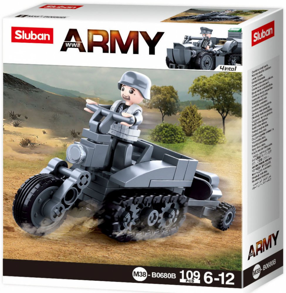 Tento vojenský pásový motocykl se bude líbit všem, kteří se zajímají o druhou světovou válku. Inovativní stavebnice Sluban je možno kombinovat s podobnými stavebnicemi mnoha dalších významných výrobců. Jsou vyráběny z kvalitního, nezávadného a odolného ABS plastu. Každá stavebnice je opatřena návodem k sestavení a balena v pestře potištěné papírové krabičce.
