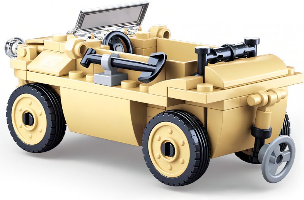Sestav si německý obojživelný vůz z 2. světové války. Jezdí po souši i ve vodě. Vůz je po sestavení dlouhý necelých 12cm, skládá se ze 106 dílků a součástí stavebnice je i voják.