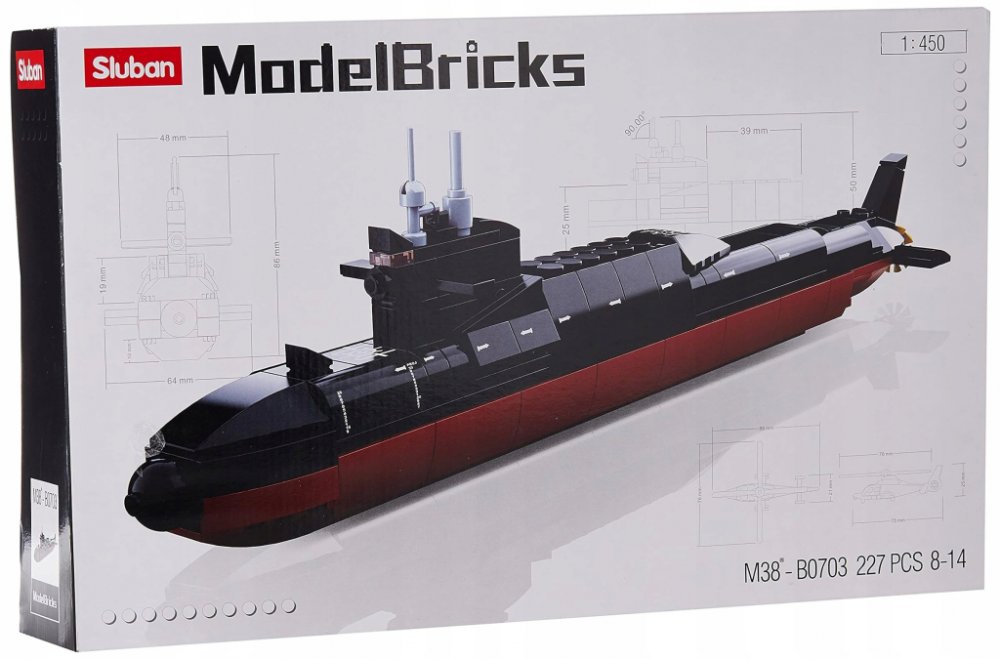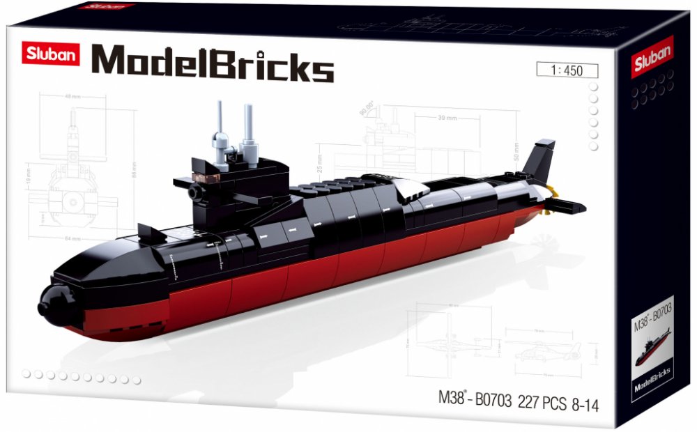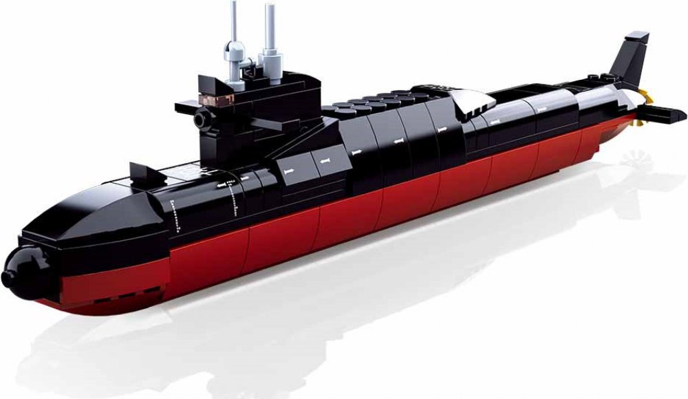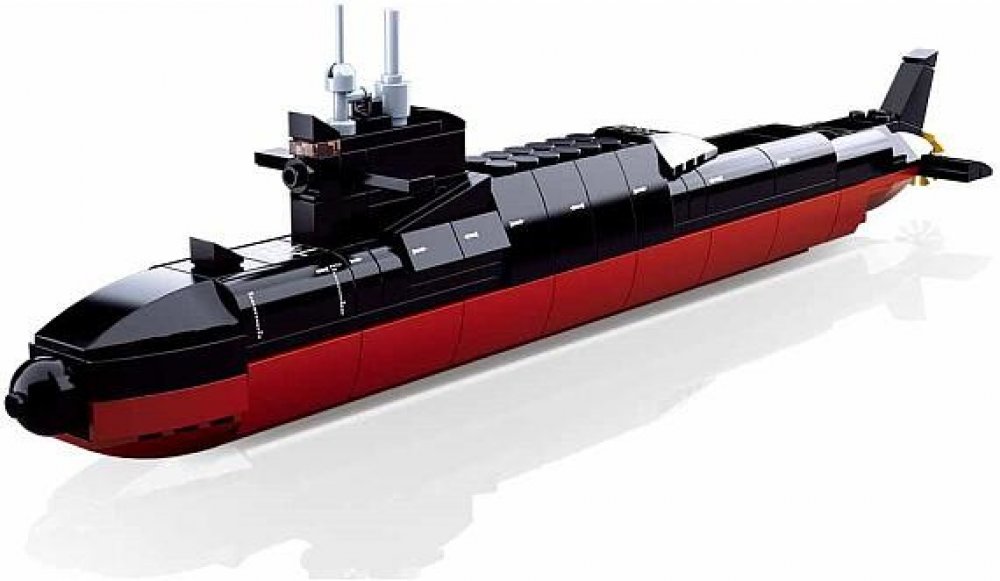Model vojenské ponorky. Inovativní stavebnice Sluban je možno kombinovat s podobnými stavebnicemi mnoha dalších významných výrobců. Jsou vyráběny z kvalitního, nezávadného a odolného ABS plastu. Každá stavebnice je opatřena návodem k sestavení a balena v pestře potištěné papírové krabičce.