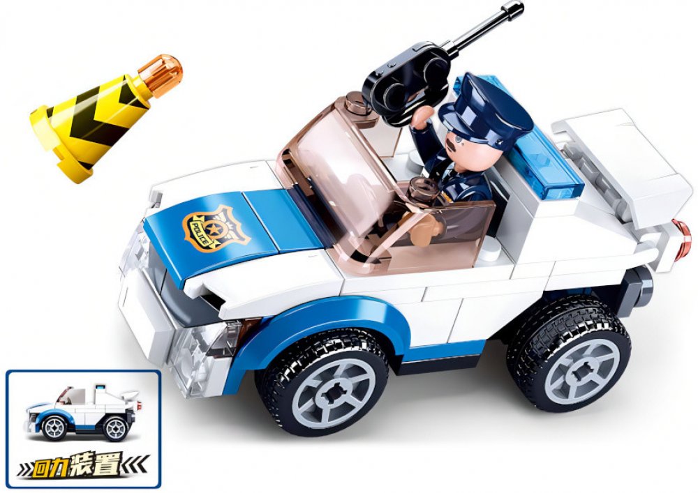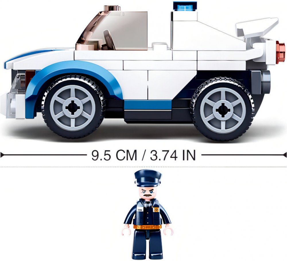 Obsah stavebnice: natahovací policejní auto a jedna figurka. Hlavní vlastnosti: