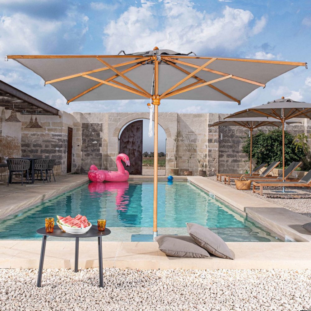 Středový stožár vyroben z tvrdého tropického dřeva iroko. Snadné roztahování slunečníku pomocí kladkového systému.