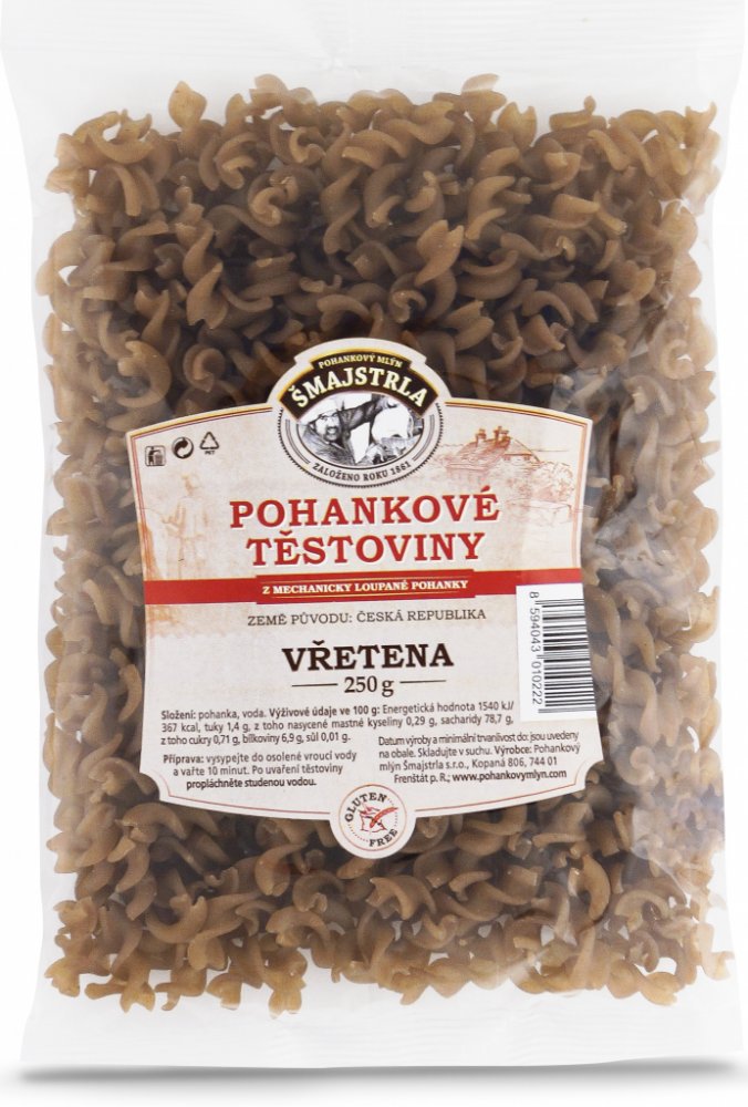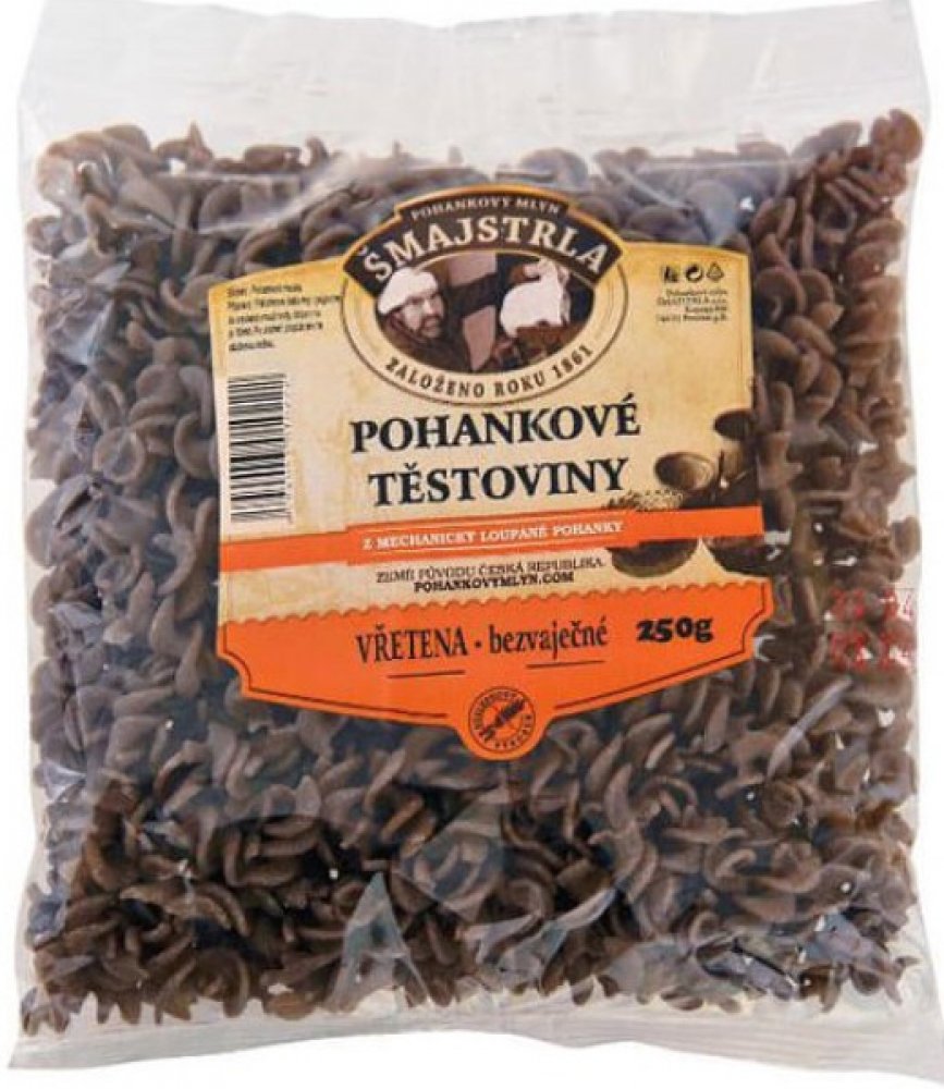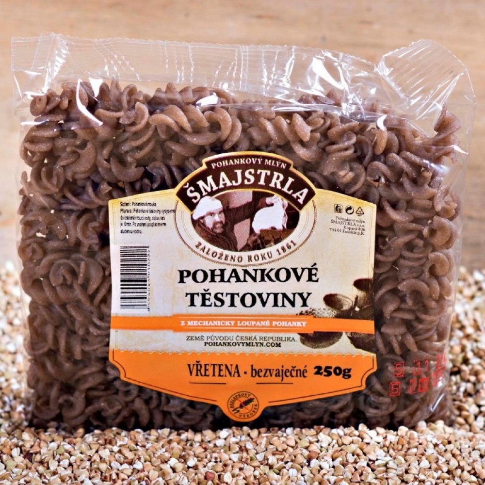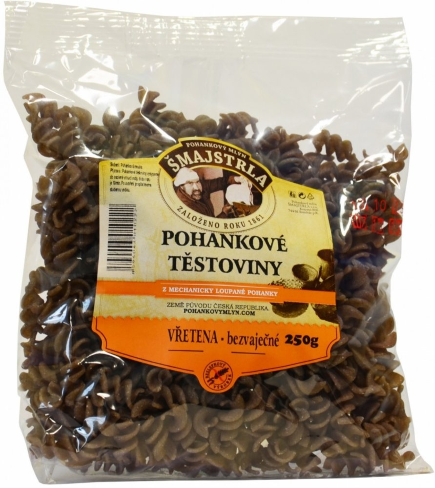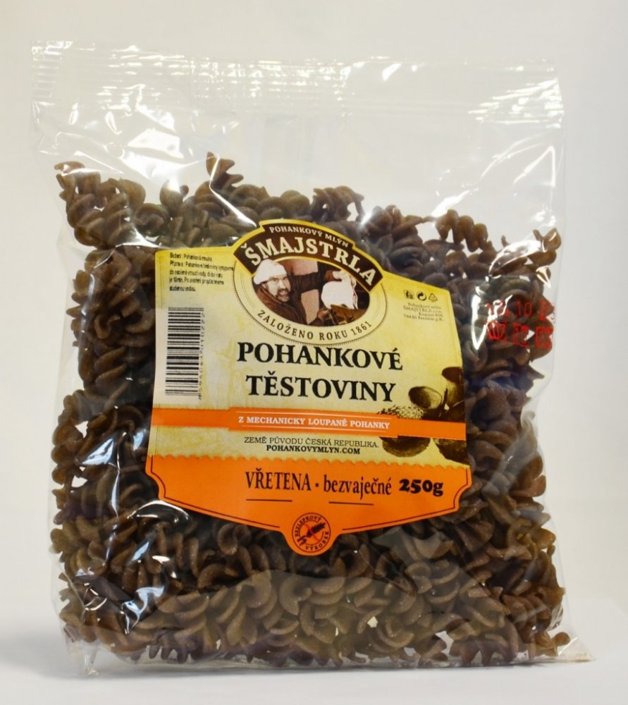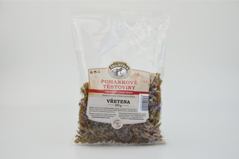 Těstoviny se vyrábí z pohankové mouky. Jsou bezvaječné a bez přídavků jiných surovin a hlavně žádná chemie. Složení: pohanková mouka a voda. Vřetena se využívají nejvíce jako příloha nebo na zapékání. Pro mlsné jazýčky variace s tvarohem a ovocem... Protože je to potravina bezlepková, přidejte při vaření o trochu více vody, než jste zvyklí a kapku olivového oleje. Po uvaření nechte ve vodě ještě c...