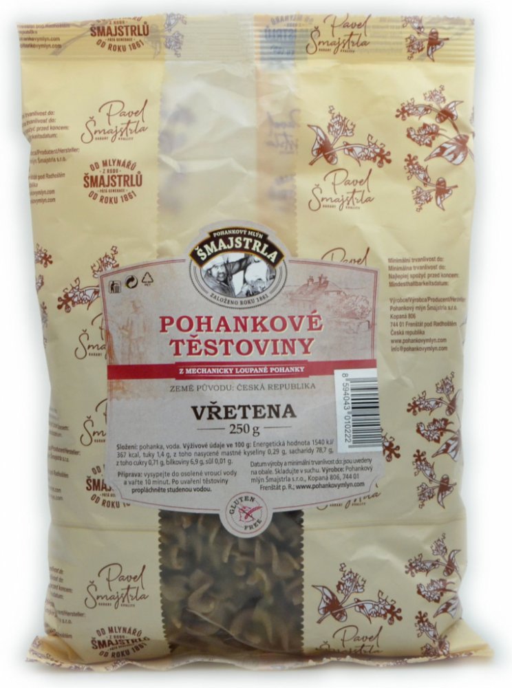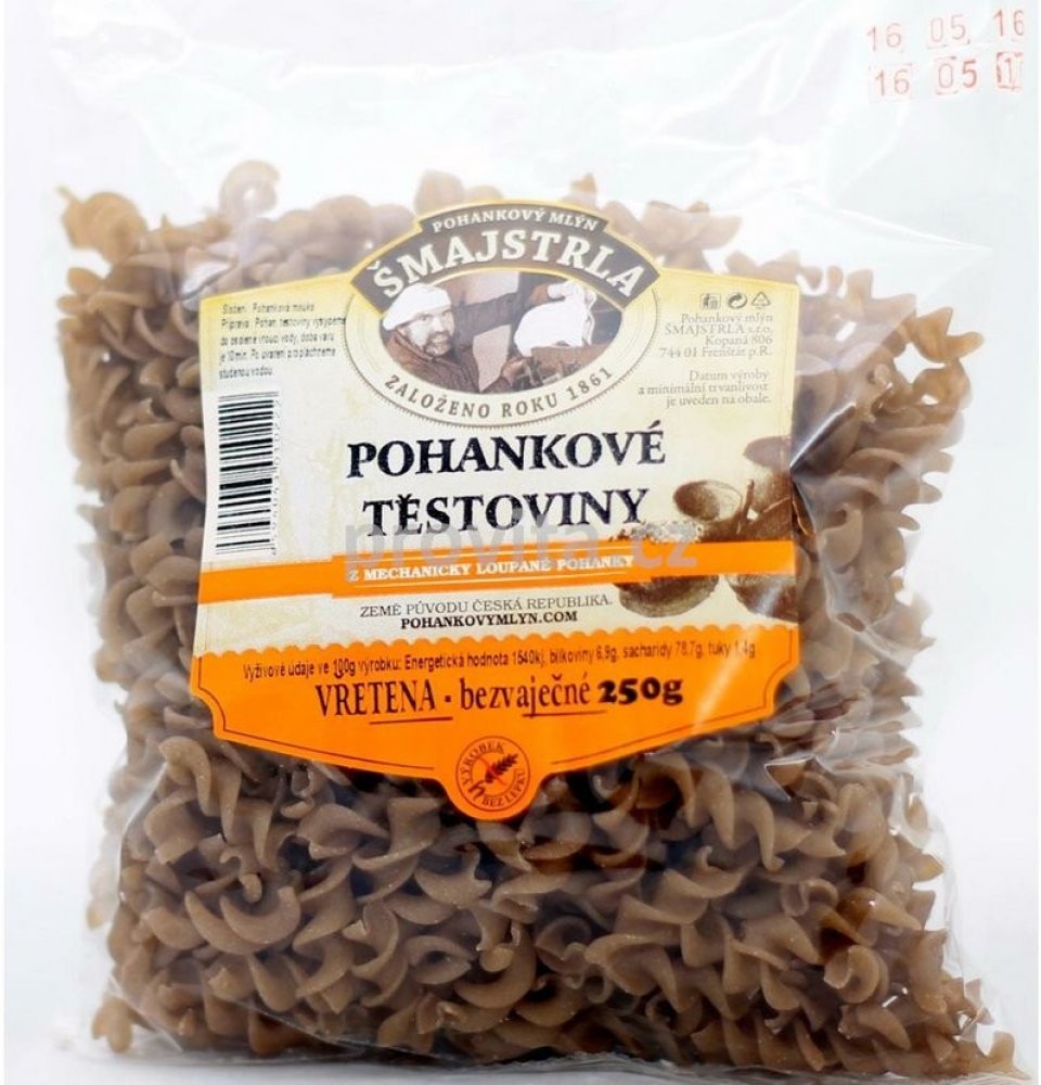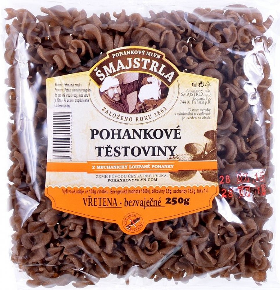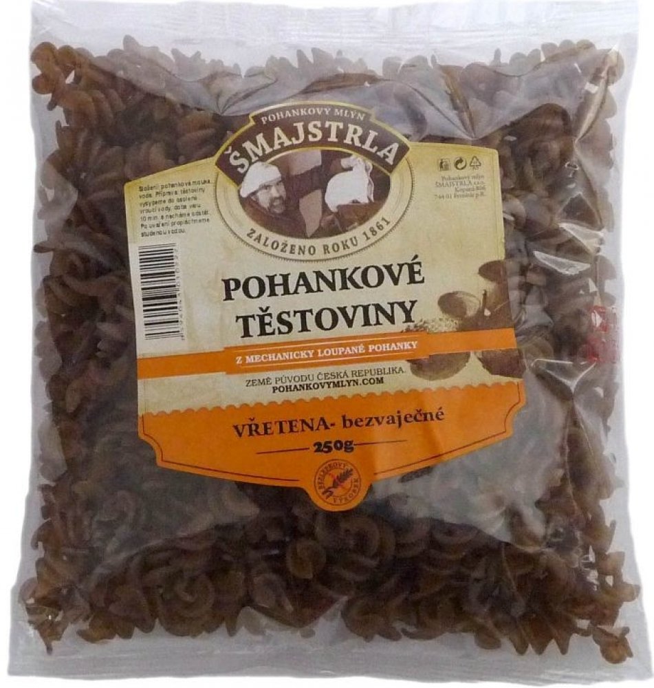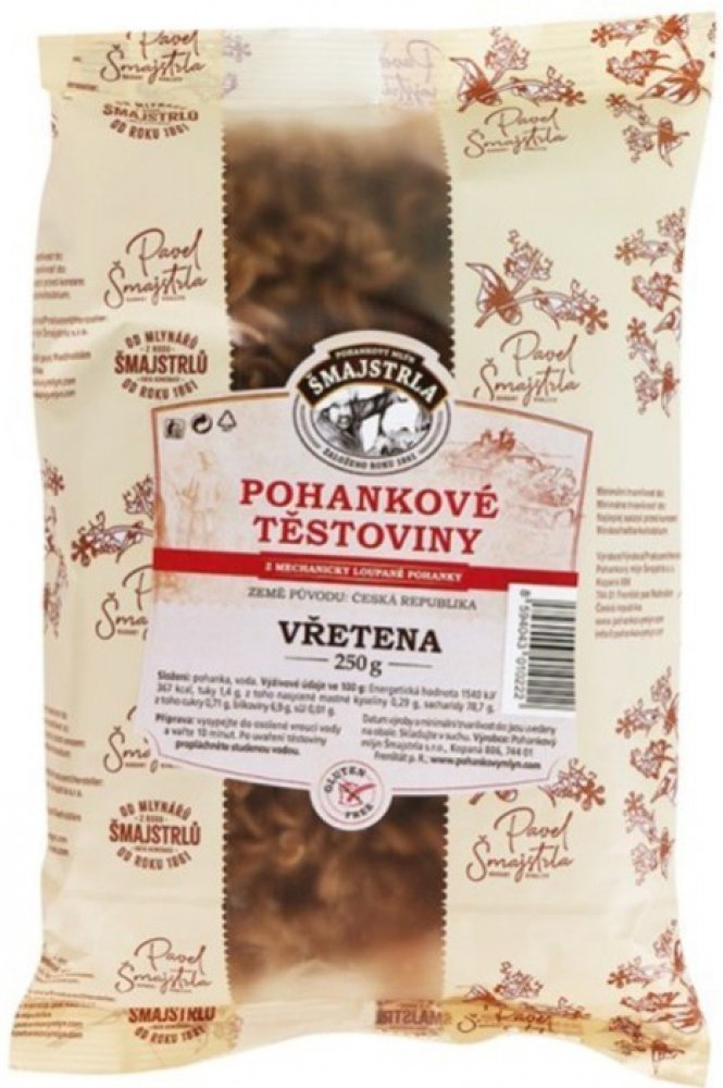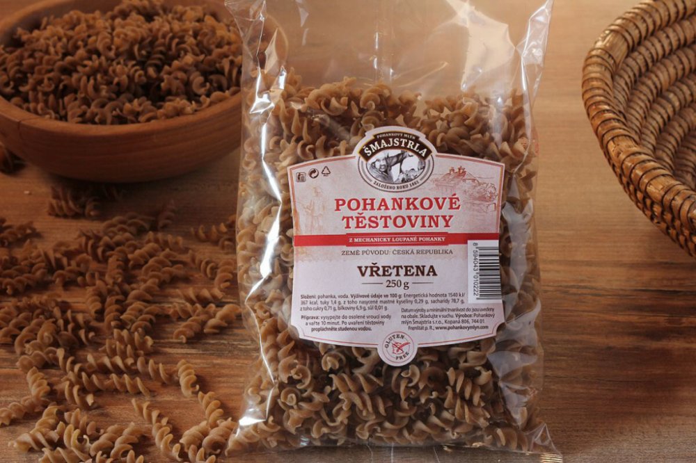 Těstoviny se vyrábí z pohankové mouky. Jsou bezvaječné a bez přídavků jiných surovin a hlavně žádná chemie. Složení: pohanková mouka a voda. Vřetena se využívají nejvíce jako příloha nebo na zapékání. Pro mlsné jazýčky variace s tvarohem a ovocem... Protože je to potravina bezlepková, přidejte při vaření o trochu více vody, než jste zvyklí a kapku olivového oleje. Po uvaření nechte ve vodě ještě c...