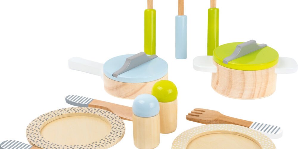 S tímto barevným nádobím z robustního dřeva je vaření pro hosty skvělou zábavou. Odnímatelné pokličky nádobí se snadno uchopují. Tímto způsobem se může dětská kuchyně v mžiku stát kuchyní špičkového šéfkuchaře. Děti mohou zároveň trénovat sociální kompetence a používání příborů! Takže hurá do vaření!