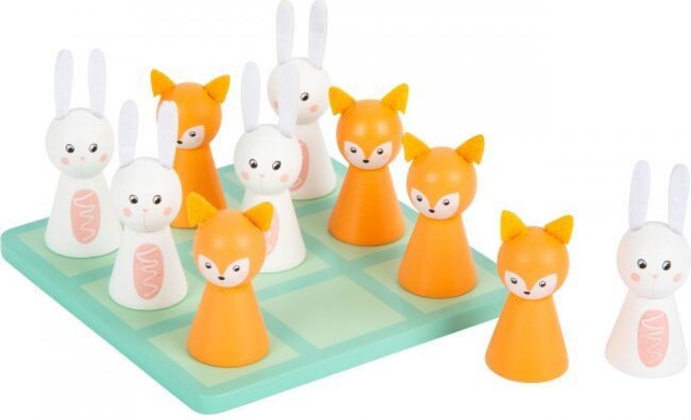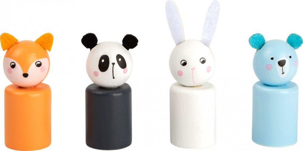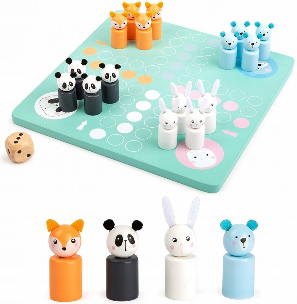 Které zvířátko se jako první dostane do svého domečku? Vyzkoušejte šikovnou hru v pastelových barvách s dřevěnými figurkami ve tvaru zajíce, pandy, medvěda a lišky.